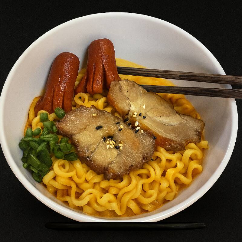 Un Ramen picante, preparado con ajonjoli, alga, 2 salchipulpos, 100 gramos de pork belly.