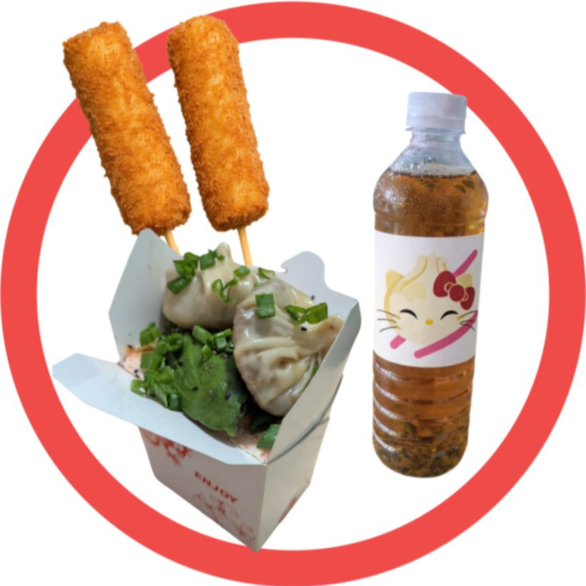 1 bebida embotellada*1 + Dedo de queso*2 + Arrochito*1 + orden de 2 dumplings*1
