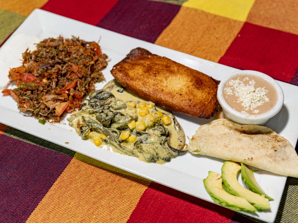 Machaca a la mexicana, tamal de elote frito, con rajas a la crema. Acompañado de frijol, quesadilla y panela