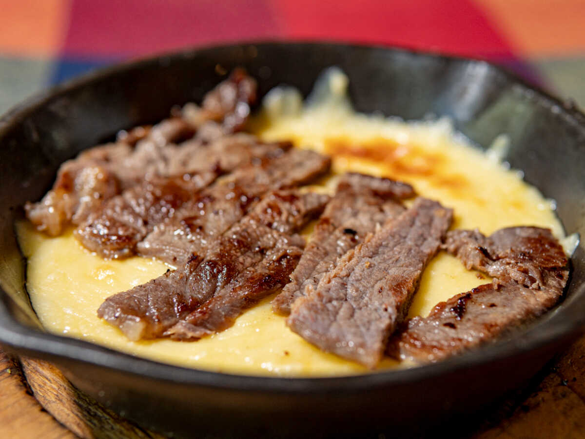Carne asada (400gr) acompañado de puré de papa, quesadilla de harina, guacamole, tortillas, cebolla asada y chile toreado.