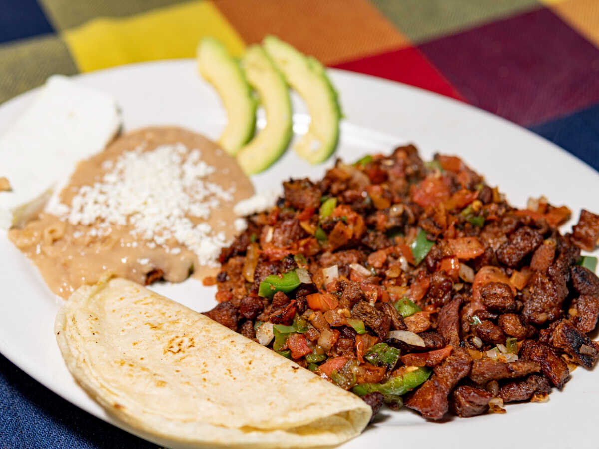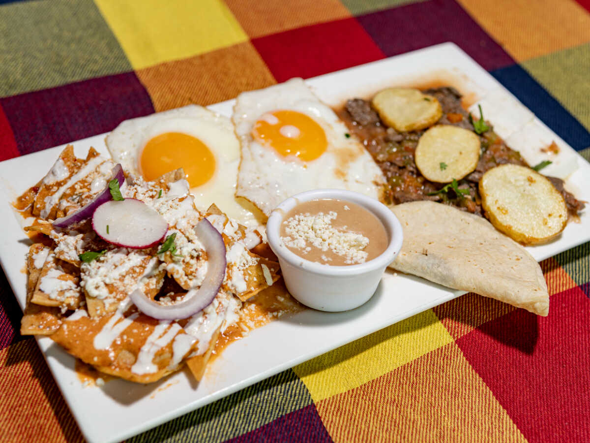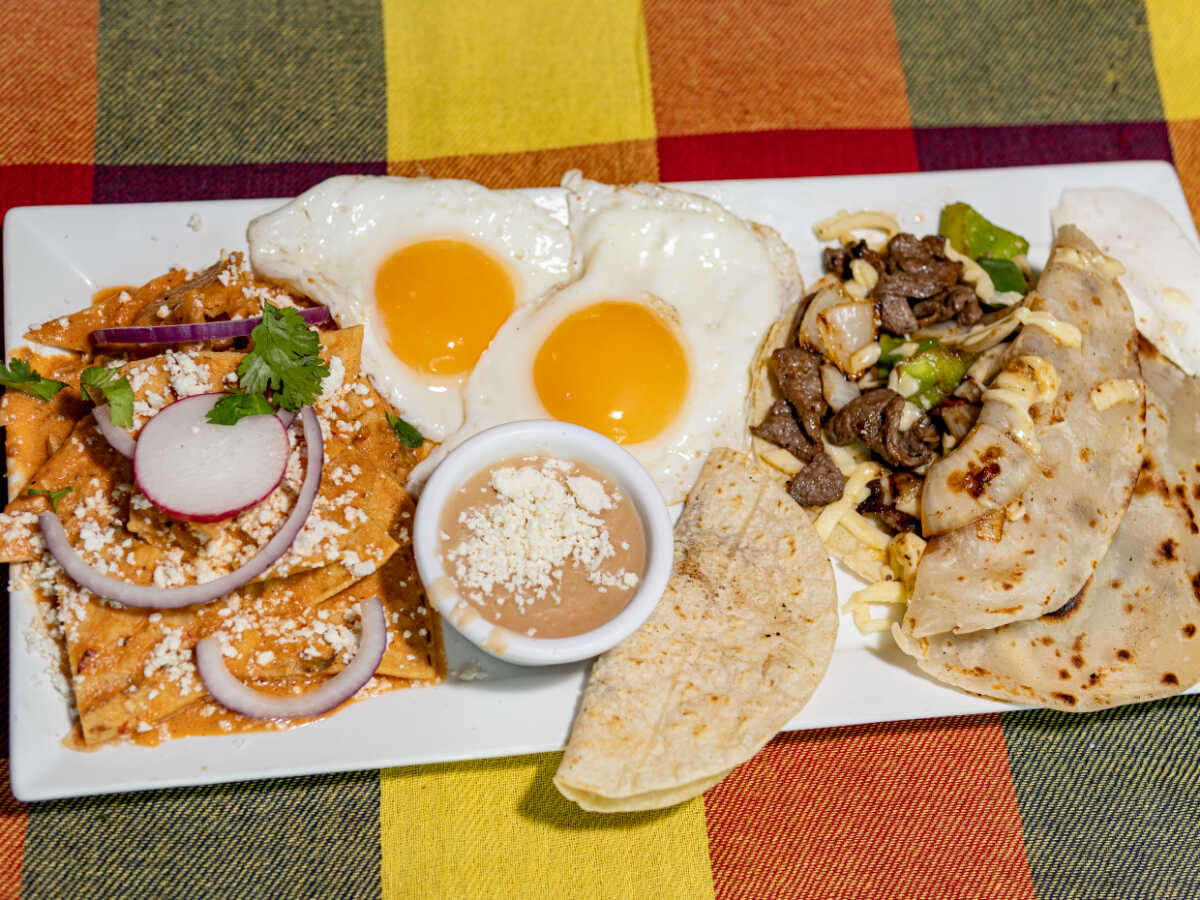 Puntas de filete gratinadas, chilaquiles rojos, huevos al gusto. Acompañado con quesadilla, frijol y panela