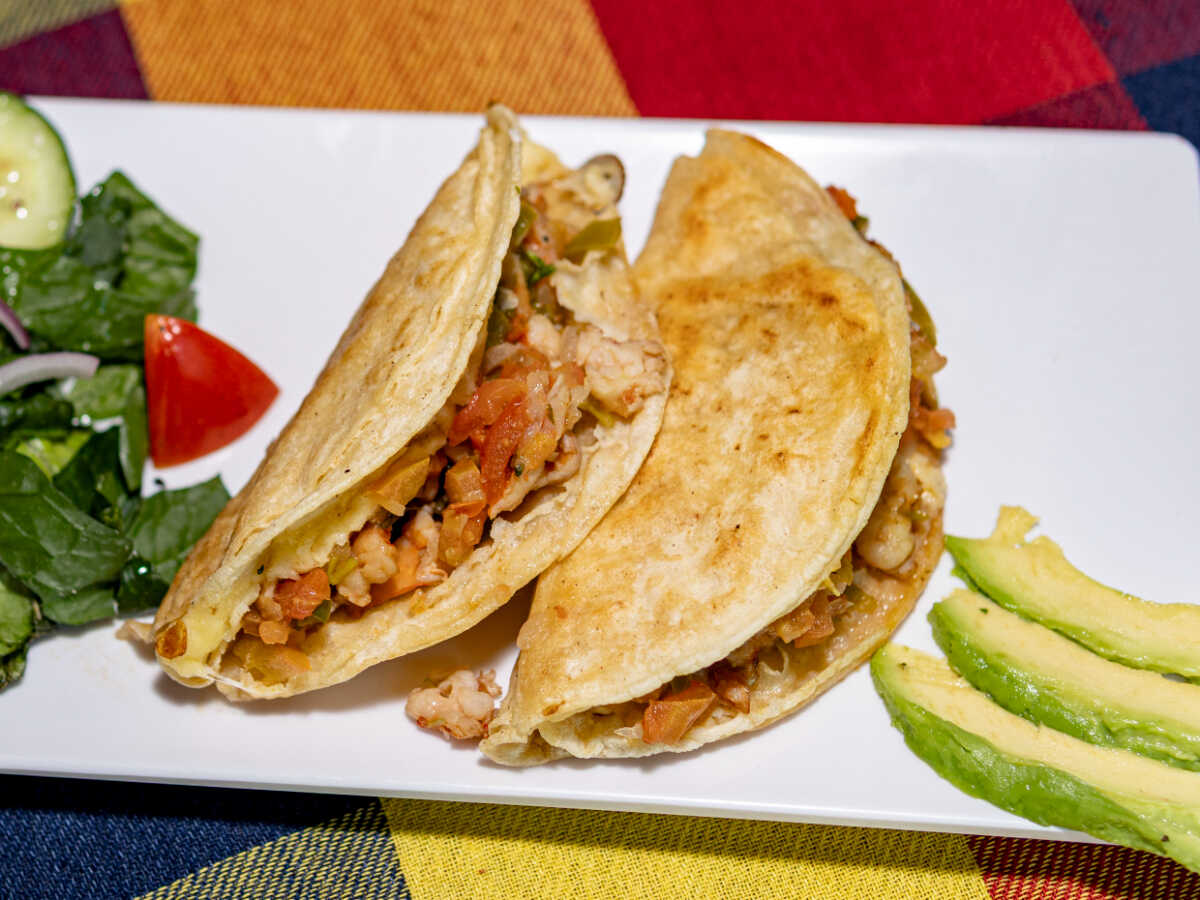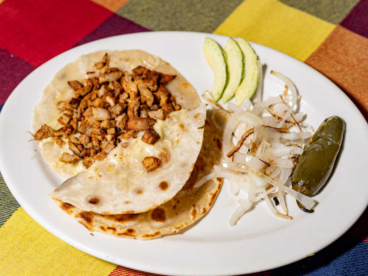 Quesadilla doble con carne acompañados de chile y cebolla