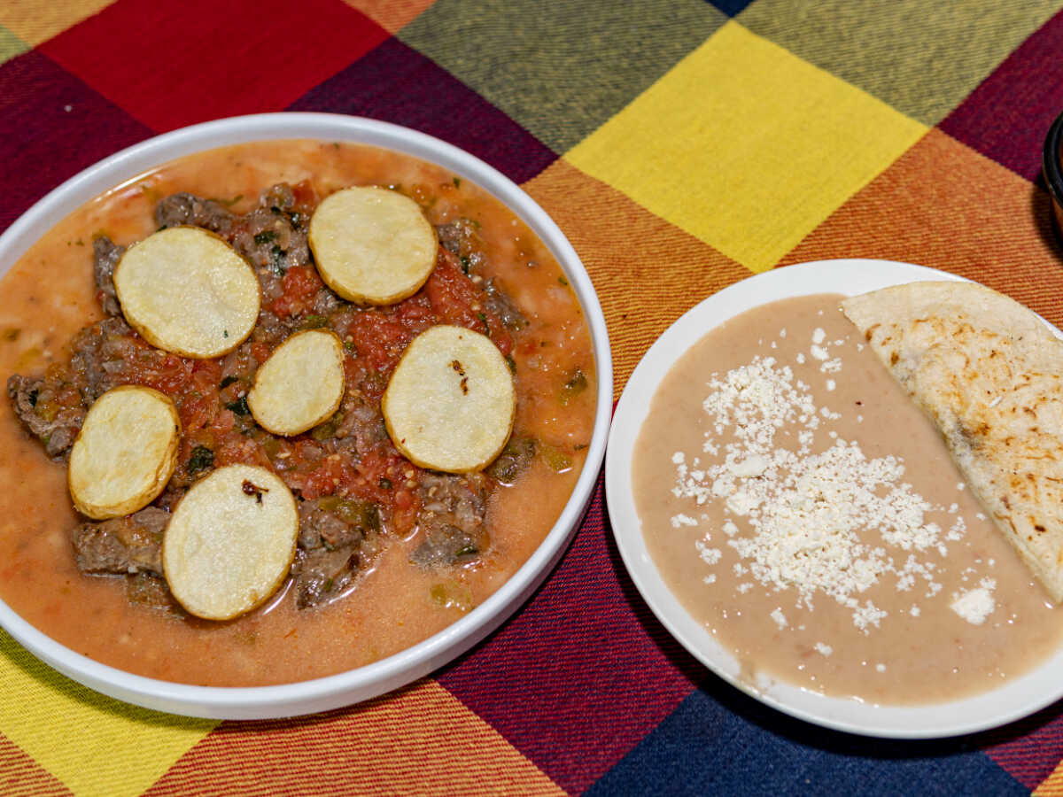 Puré de papa con queso y carne acompañado de guacamole y tortillas