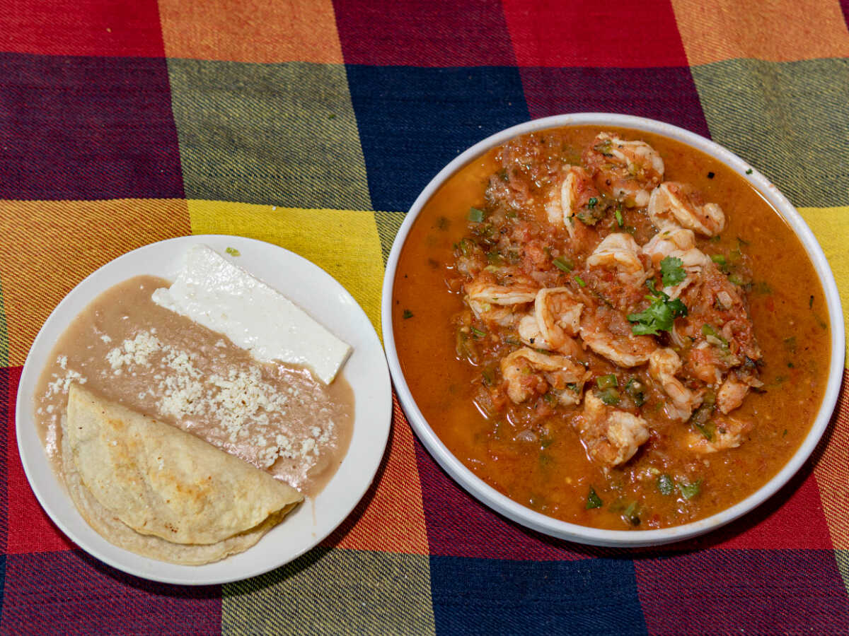 Camarones rancheros acompañados con frijol