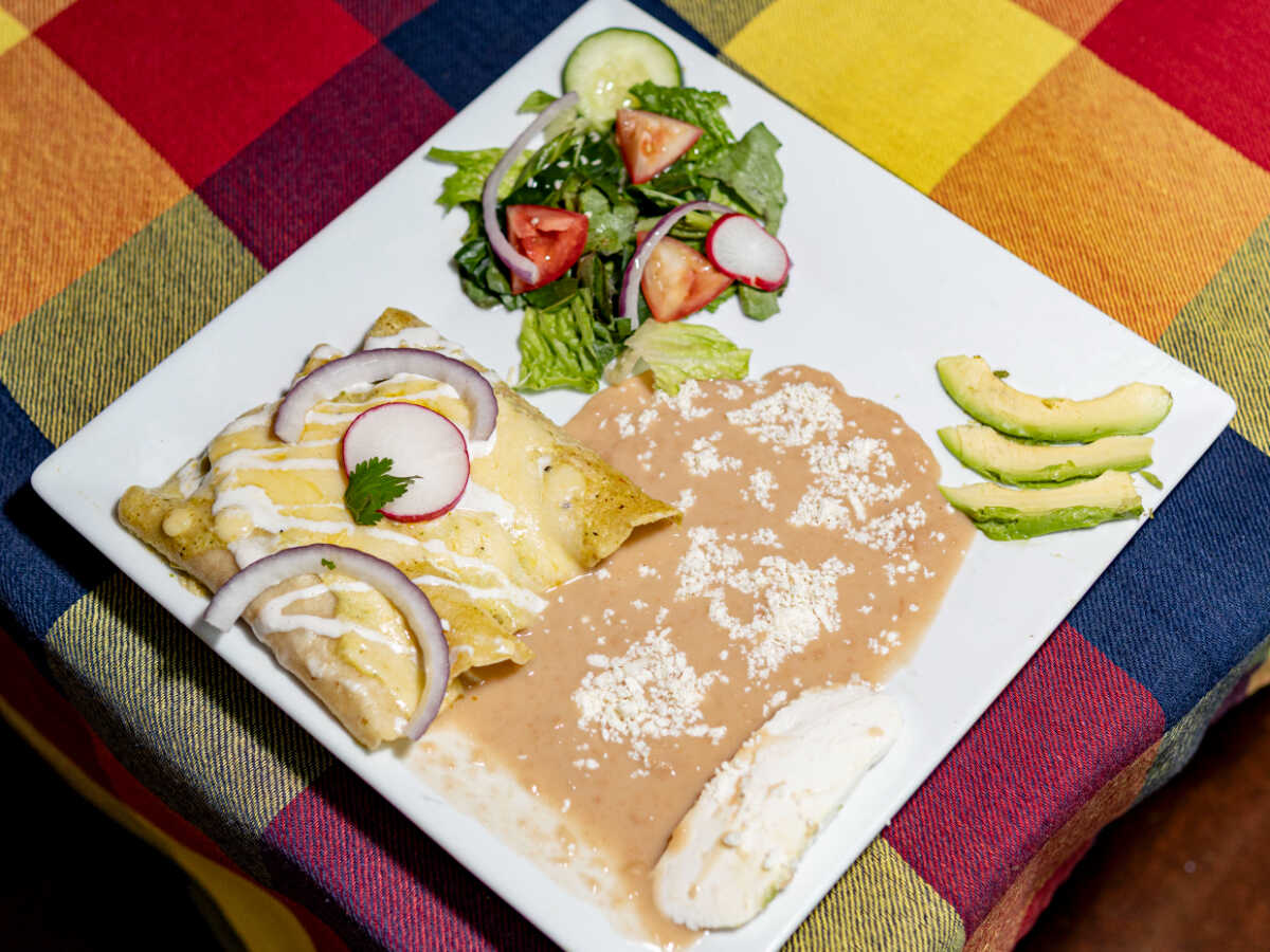 Relleno de chorizo o chilorio, queso chihuahua bañado en salsa roja cremosa, acompañado de frijol.