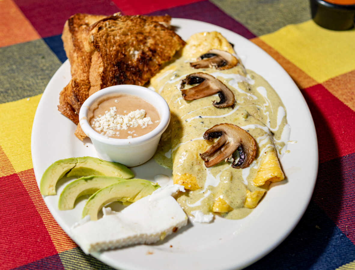 Relleno de espinaca, champiñones, salteados queso chihuahua, queso philadelphia, bañado en rica salsa poblana. Acompañado de frijol y pan