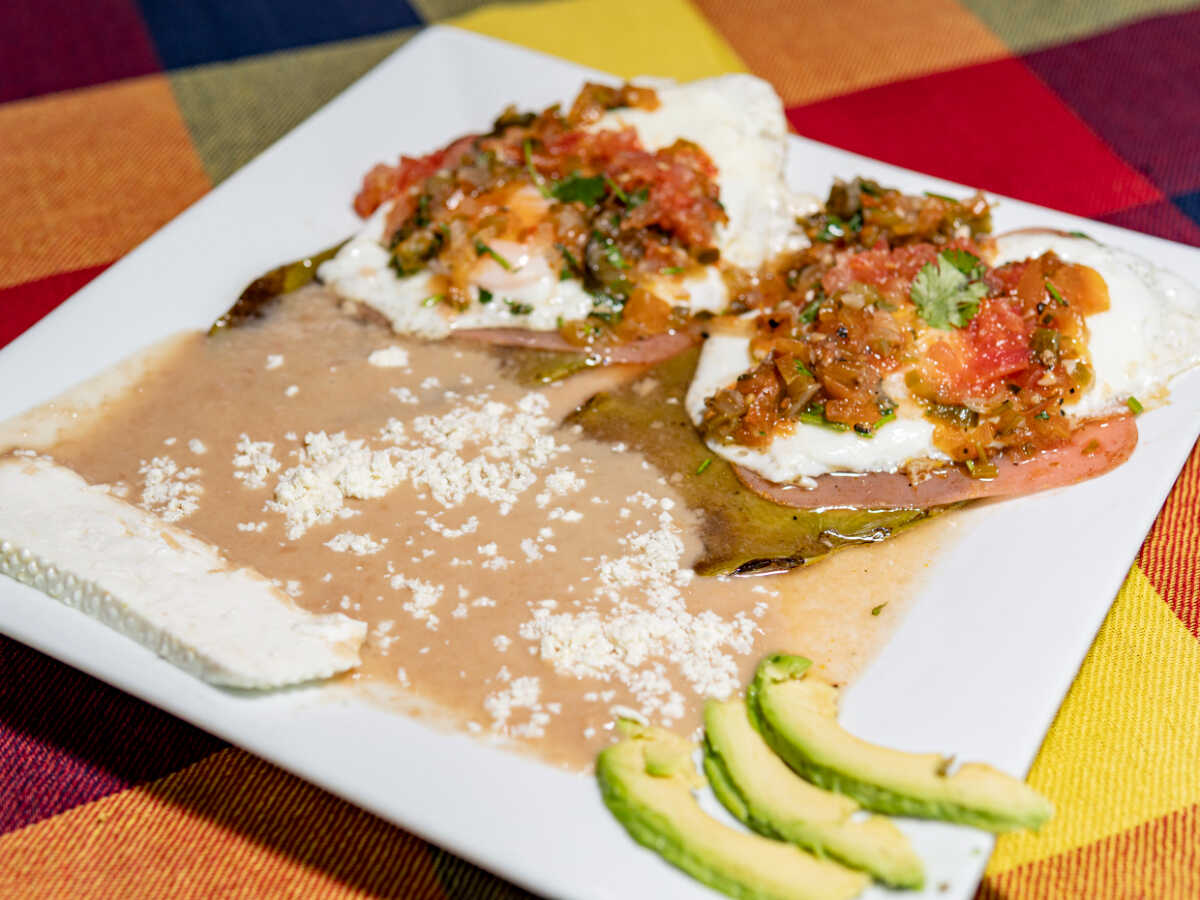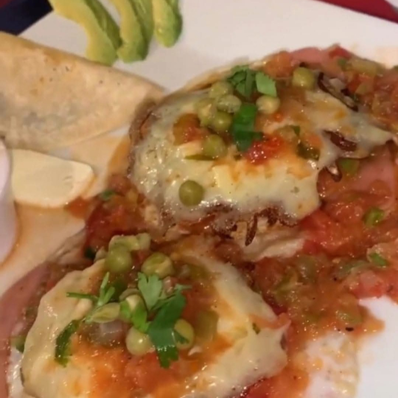Relleno de machaca la mexicana, montados sobre chilaquiles poblanos. Acompañado de salsa ranchera y frijol