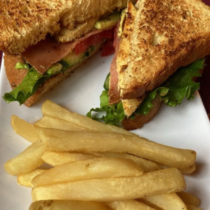 Pan multigrano con jamón, tocino, pollo, tomate y aguacate. Acompañado de papas a la francesa.