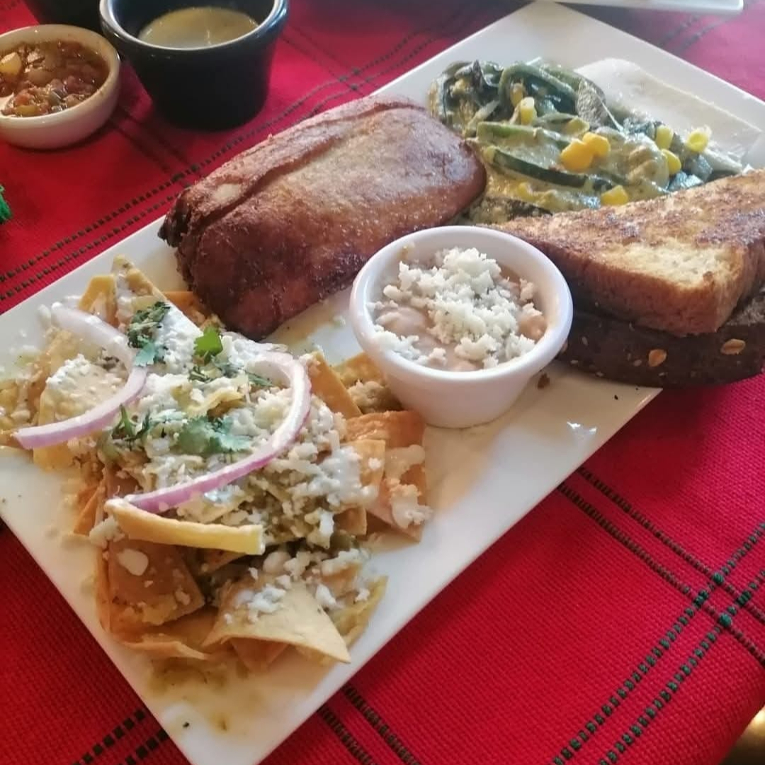 Tamal de elote frito con rajas a la crema, chilaquiles verdes. Acompañado de frijol, panela y pan