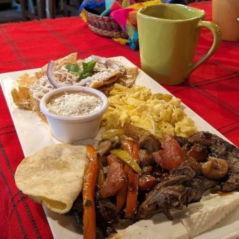 Fajitas de pollo, chilaquiles verdes, huevos al gusto. Acompañado de frijol, panela y pan