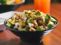 Arroz frito con new york (50 gr), camarón (30 gr), pollo (50 gr), verduras, coronado con tampico, Philadelphia y aguacate. bañado con salsa mongolia y furikake.