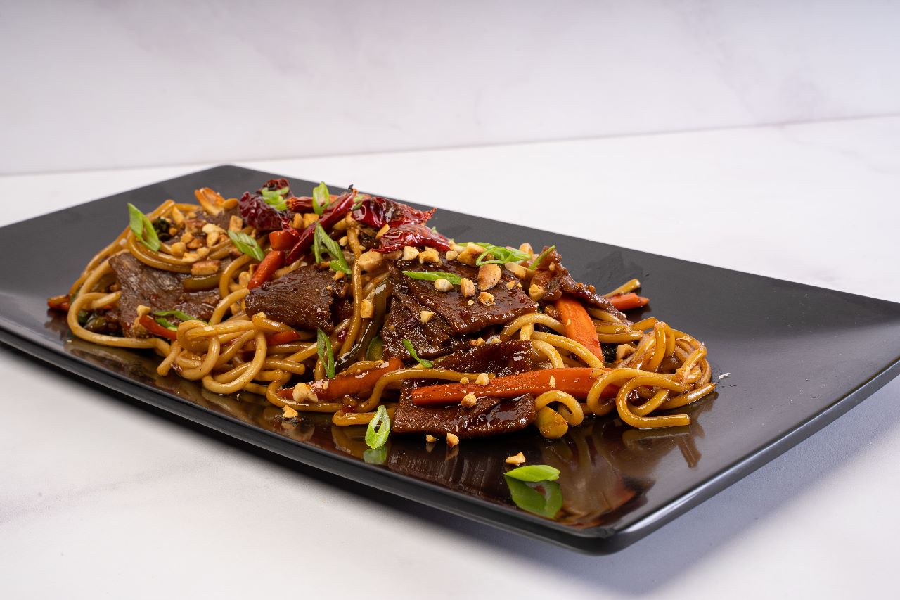 Noodles con finos cortes de New york (160 gr), salteados en una salsa de jengibre, soya y spicy; con champiñón, pimiento, cebolla y zanahoria. Espolvoreado con cacahuate tostado y chile de árbol.