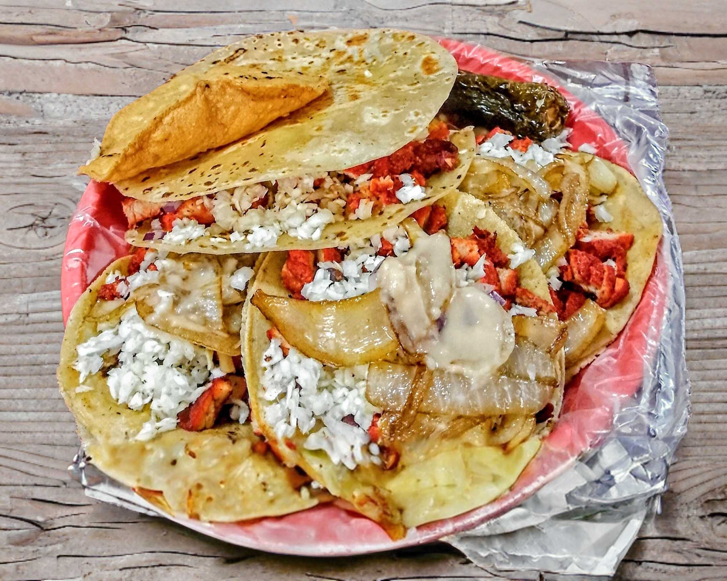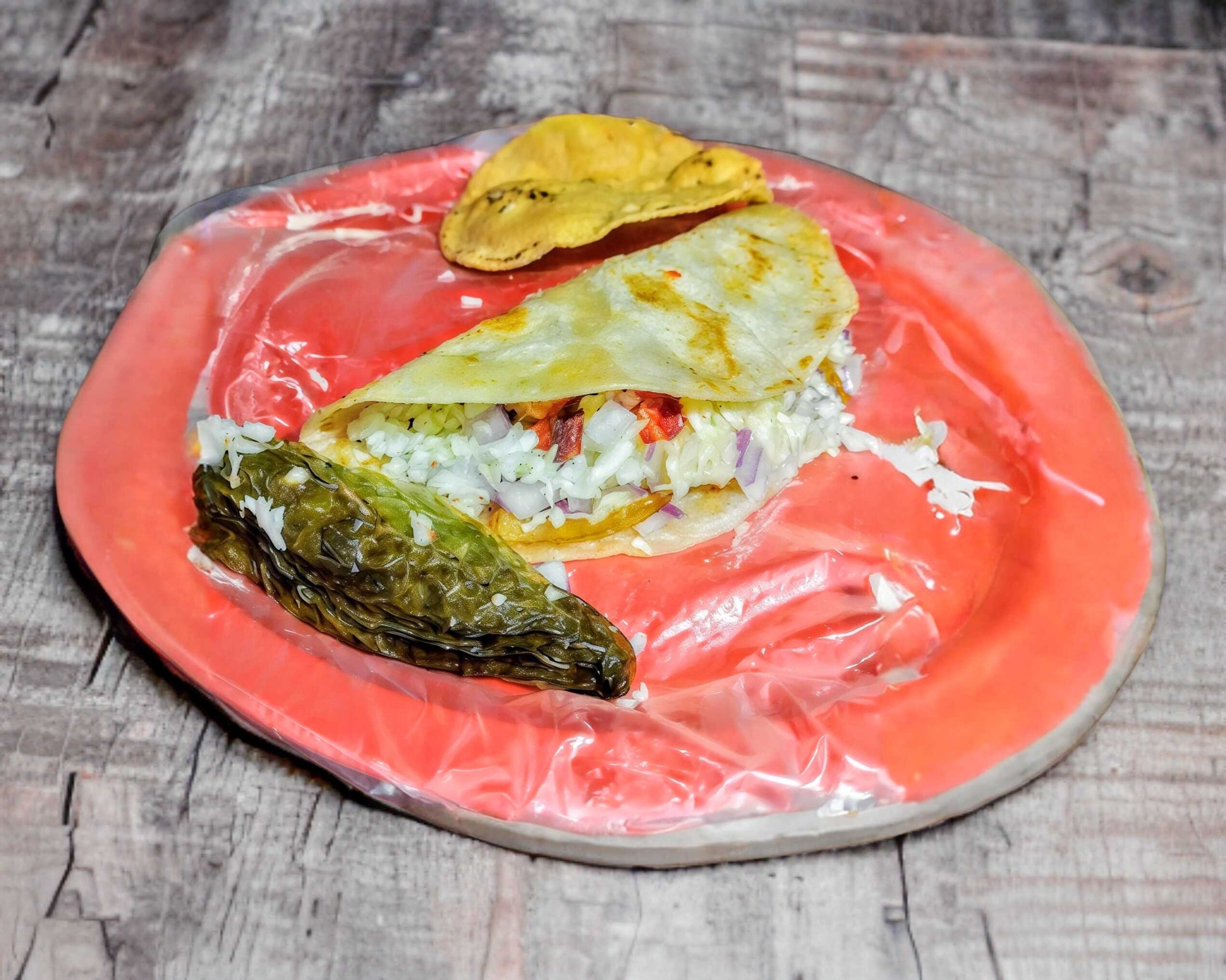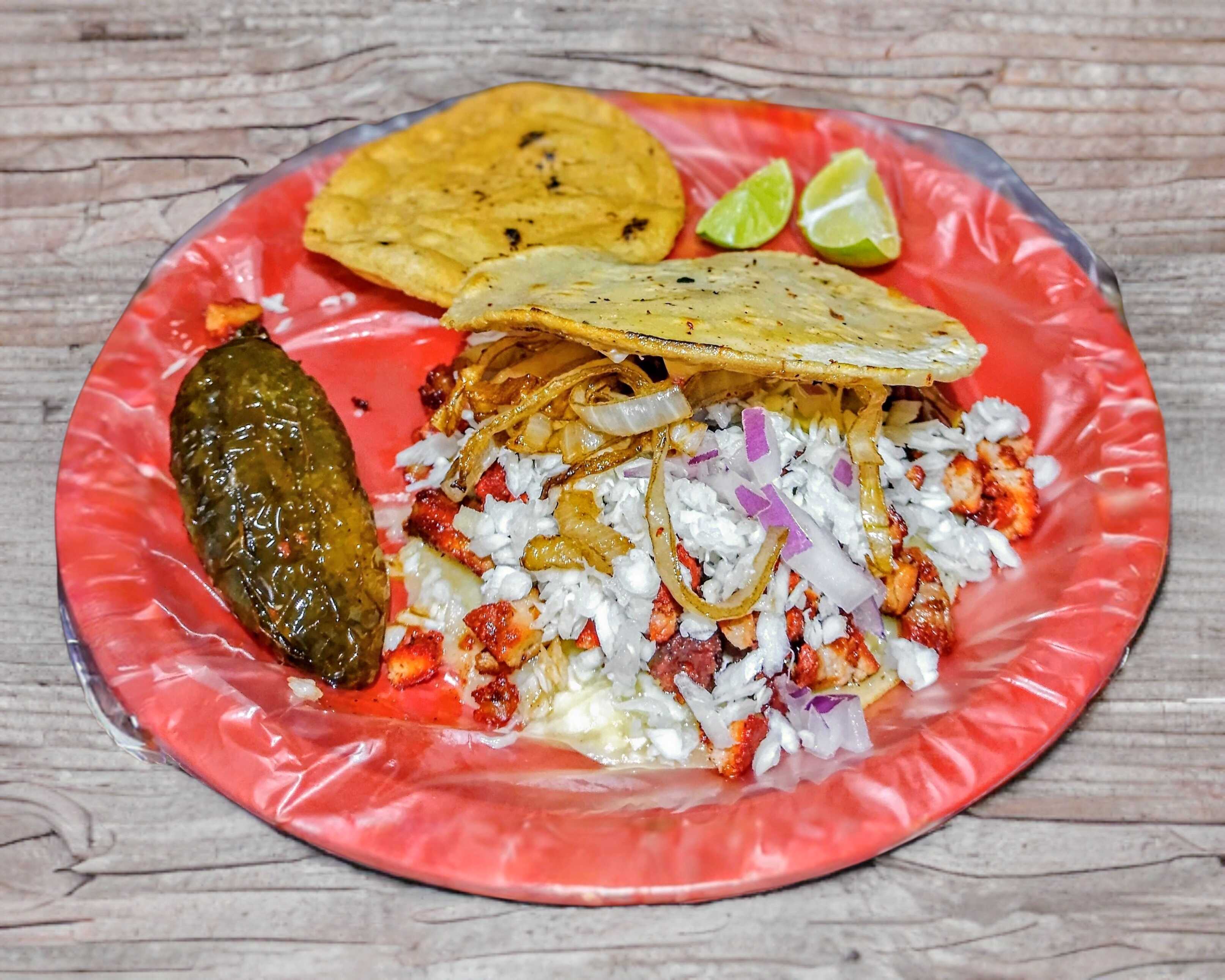 Doble tortilla taquera de maíz, base de queso y carne, por encima repollo picado, cebolla morada cruda, cebolla blanca guisada y baño de frijoles refritos. Tortillas doradas, semi doradas, blanditas, etc.