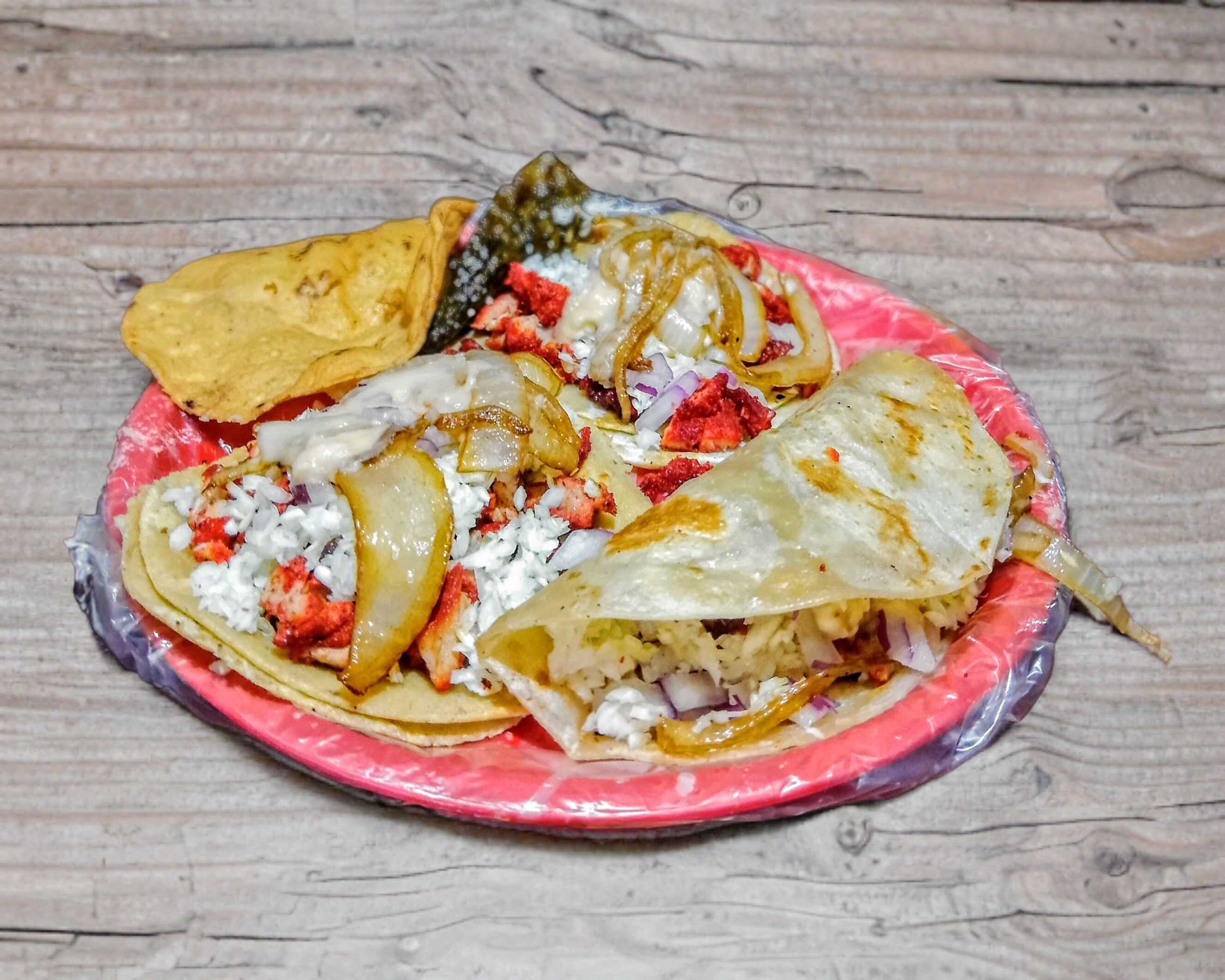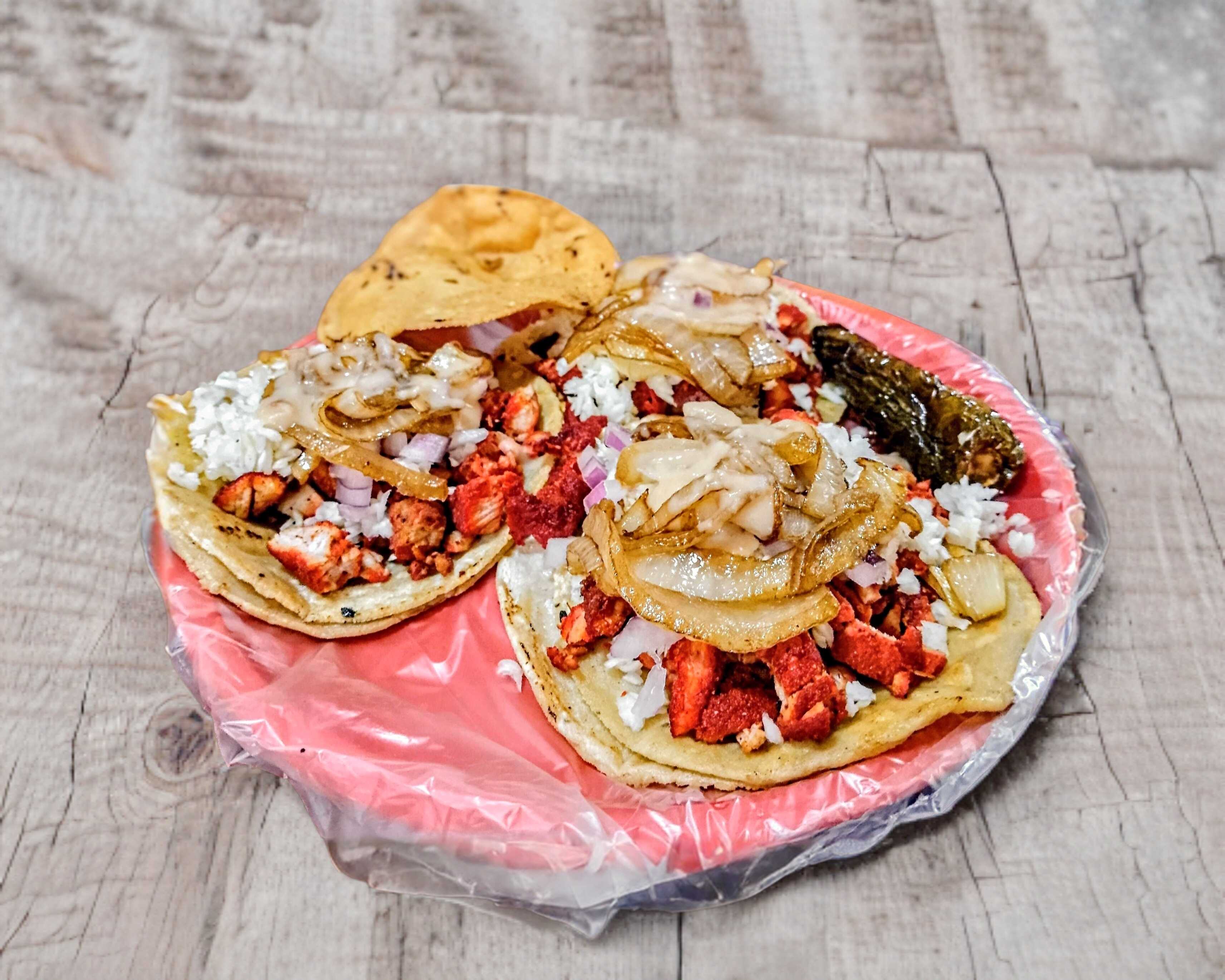 2 tacos de maíz + 1 taco de harina + 1 agua de jamaica 500ml. (Base de carne, repollo, cebolla morada cruda, cebolla blanca guisada, frijoles refritos encima, tortilla dorada, semi dorada o blandita.)