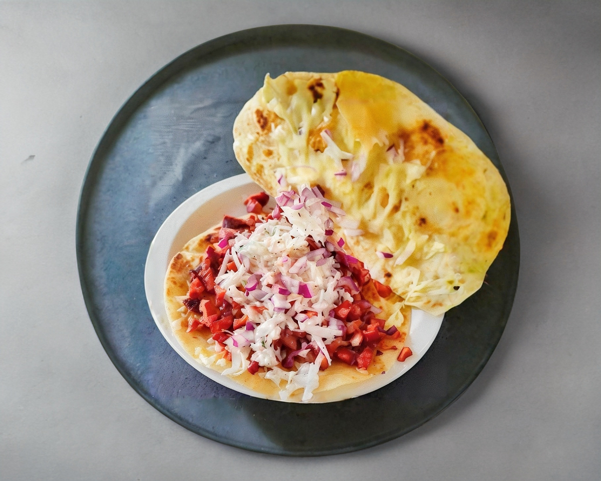 carne adobada, repollo, cebollita morada, bañados de frijol, cebollita guisada, chilito toreado y una tostadita extra