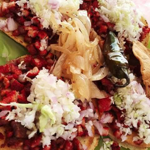 carne adobada, repollo, cebollita morada, bañados de frijol, cebollita guisada, chilito toreado