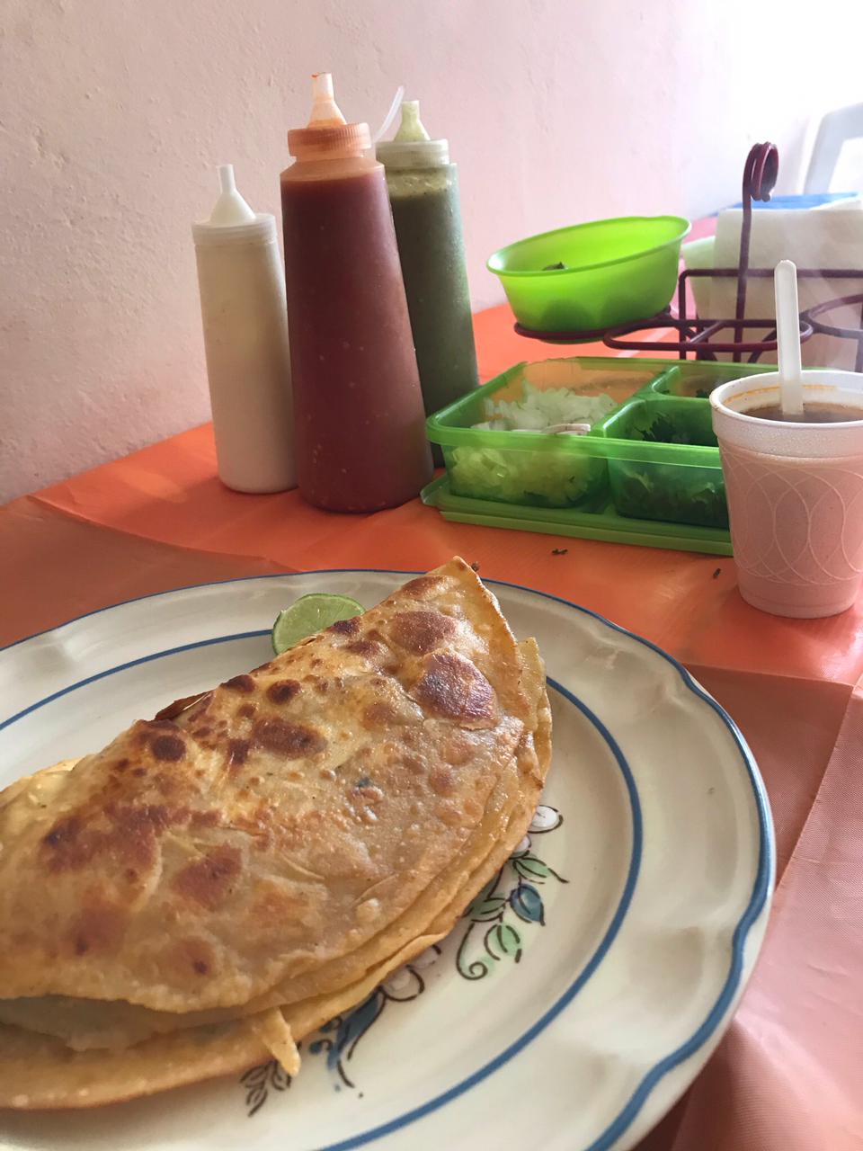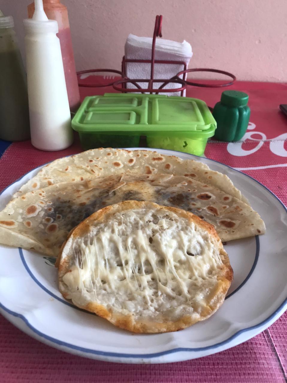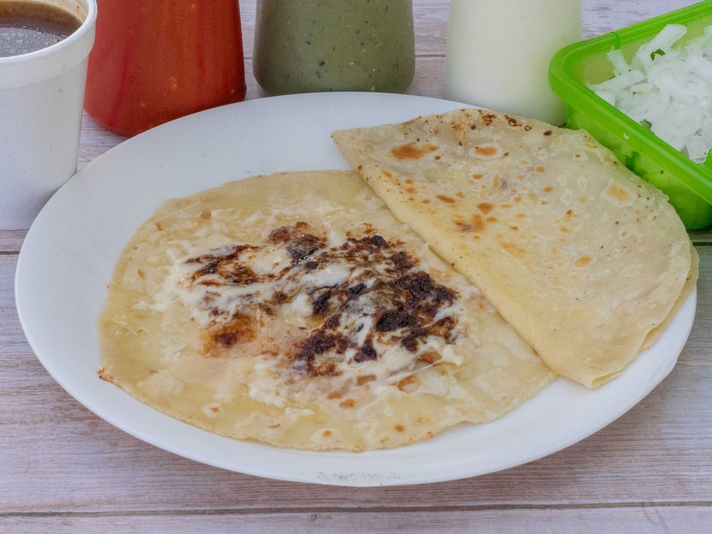 Doble tortilla grande,con queso,cebolla, cilantro,crema y salsas de la casa