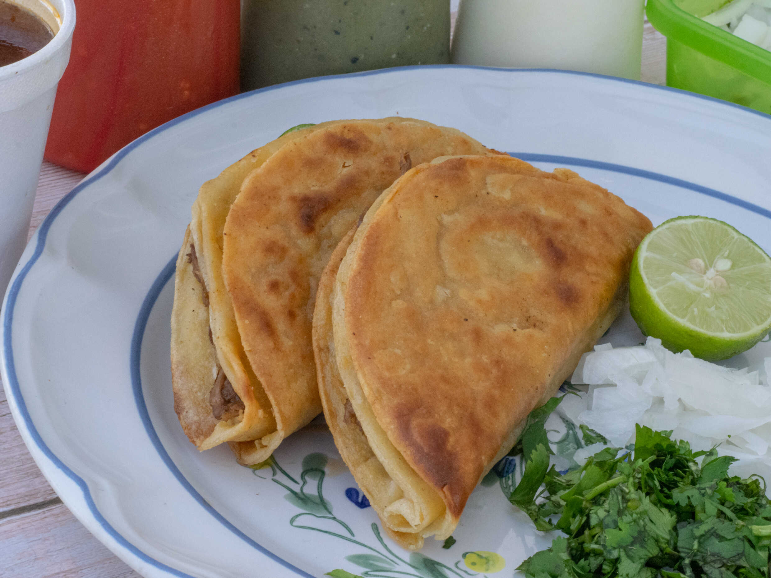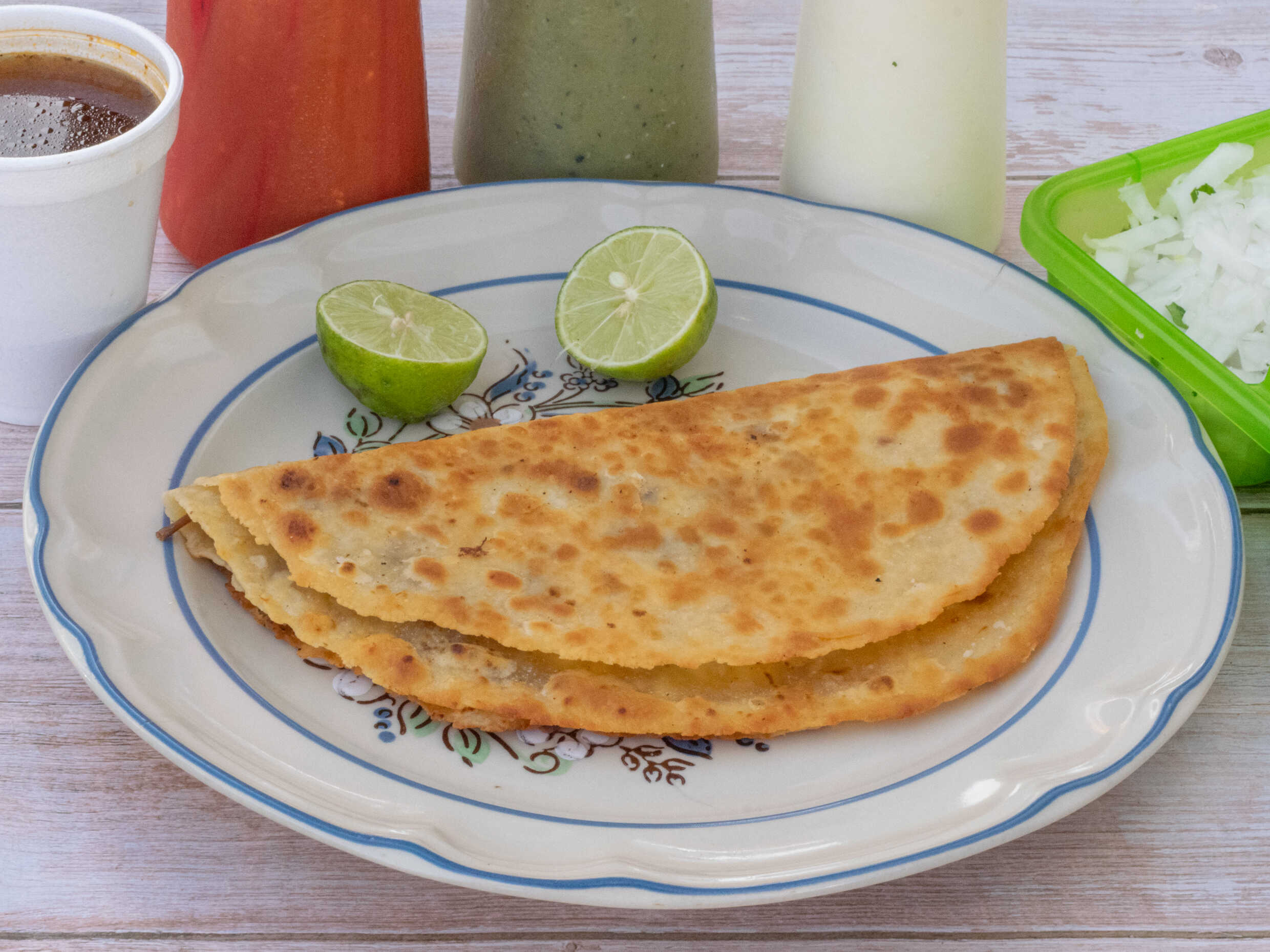 Doble tortilla,con queso,su respectiva carne de res,cebolla,cilantro, crema y salsas de la casa