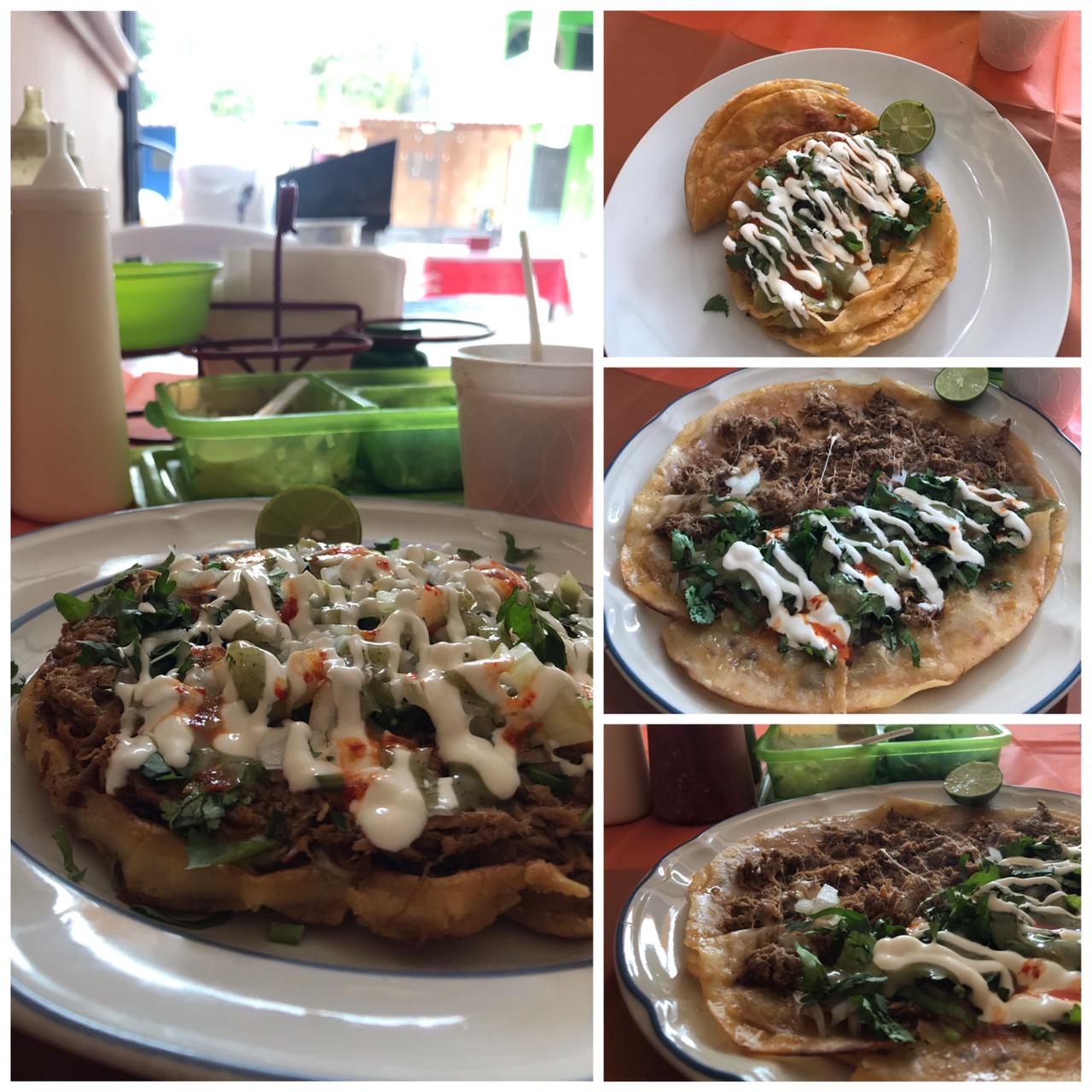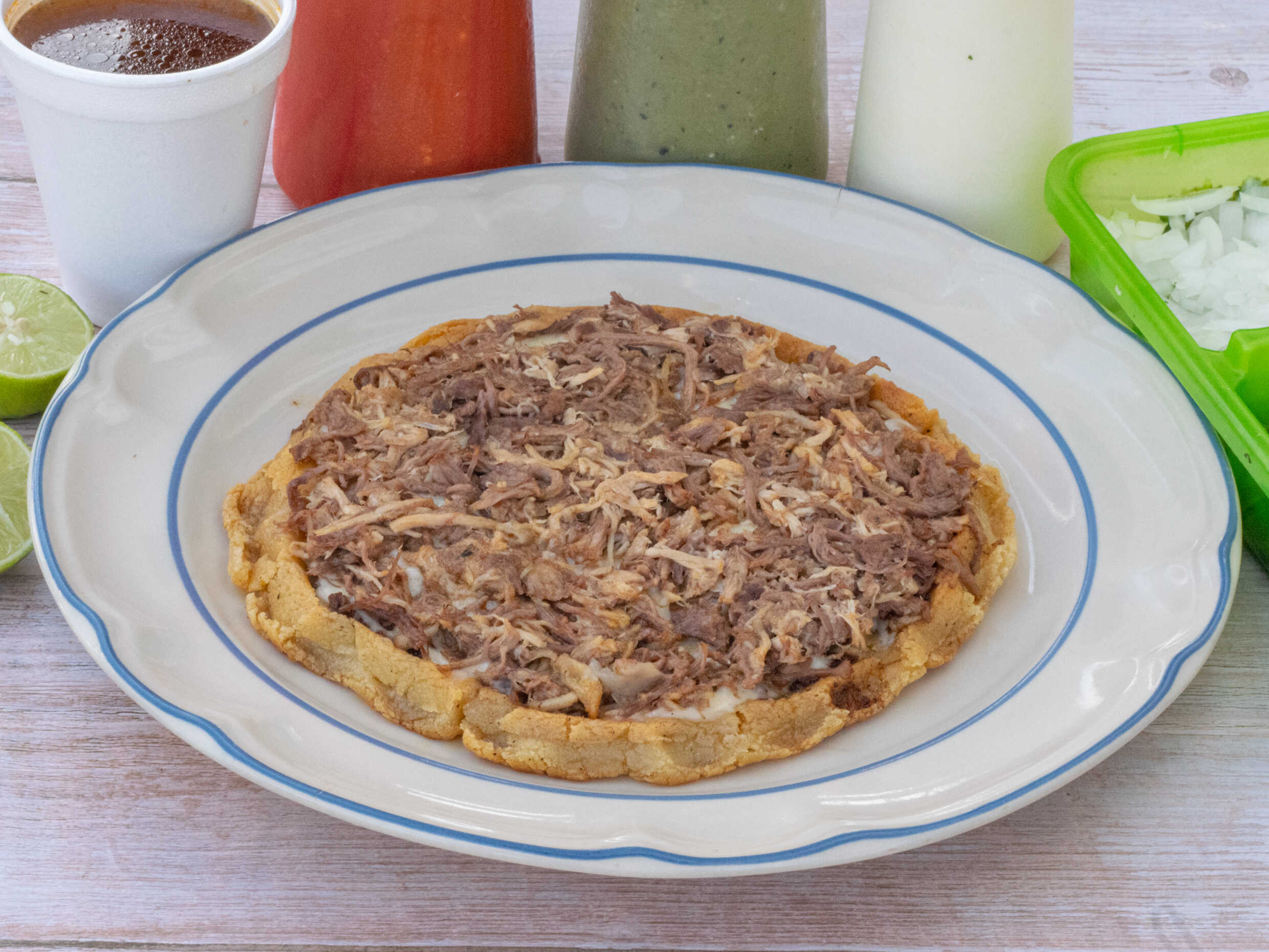 Sope hecho a mano,aciento,queso,su respectiva carne de res,cebolla, cilantro,crema y salsas de la casa