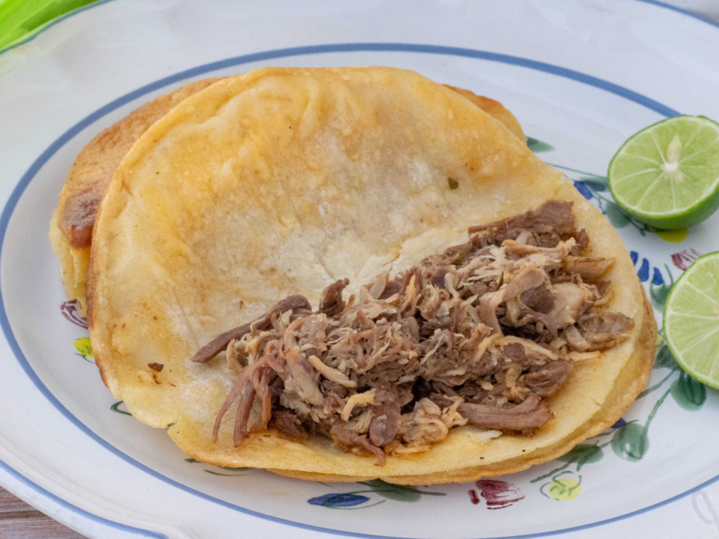 Doble tortilla,sin queso,su respectiva carne de res,cebolla, cilantro,crema y salsas de la casa