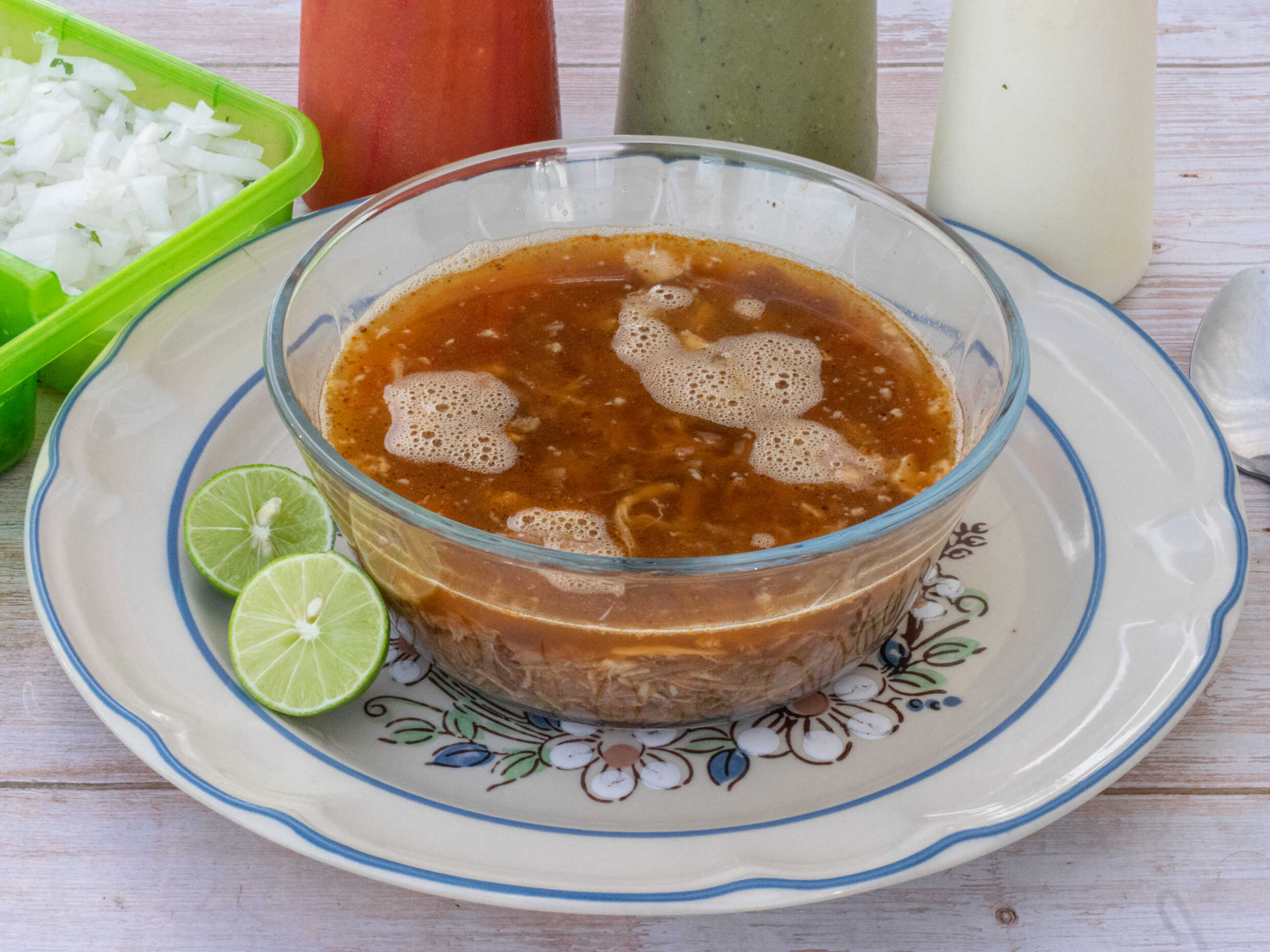 Birria en caldo, cebolla, cilantro, salsa roja y tortillas