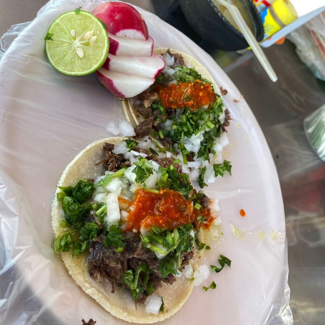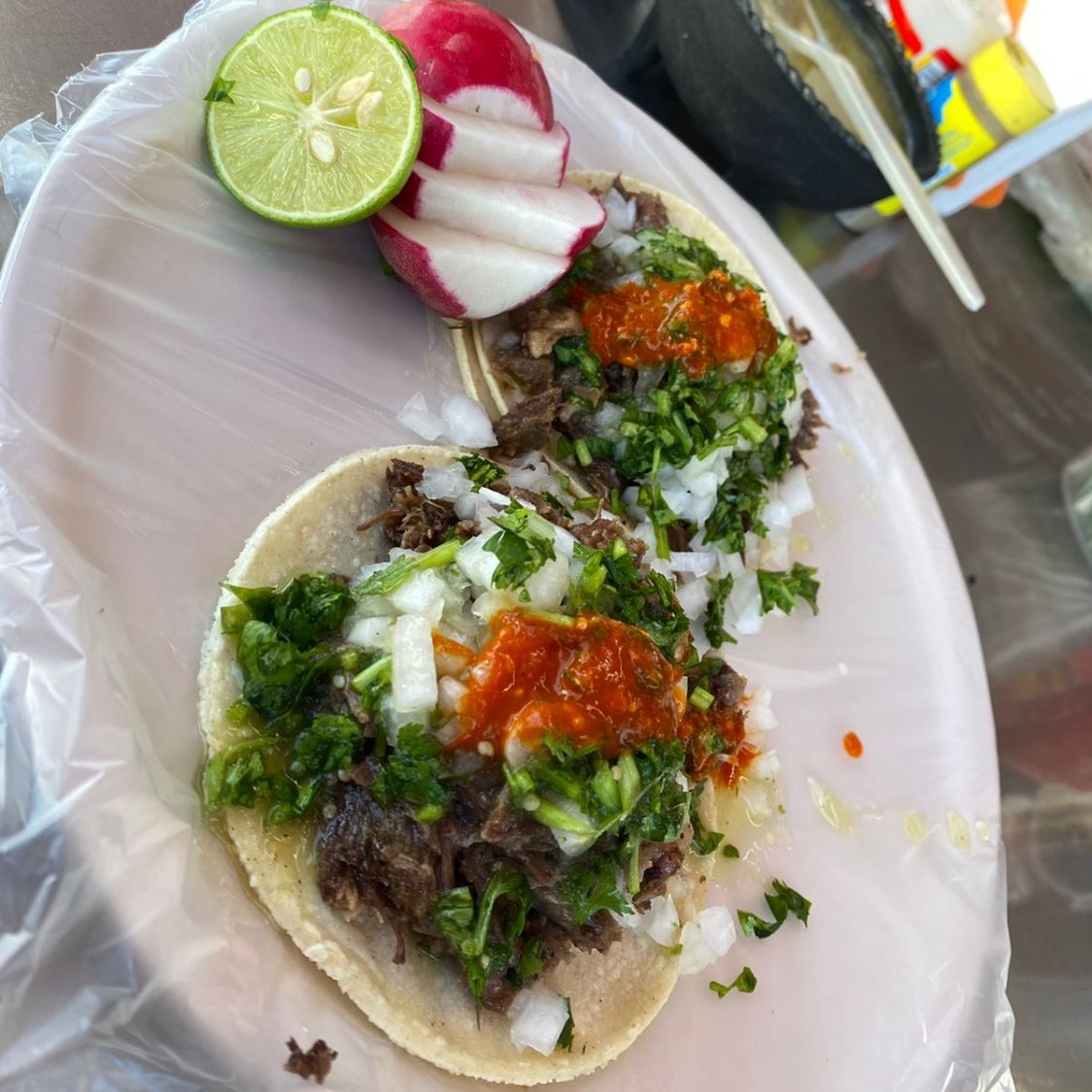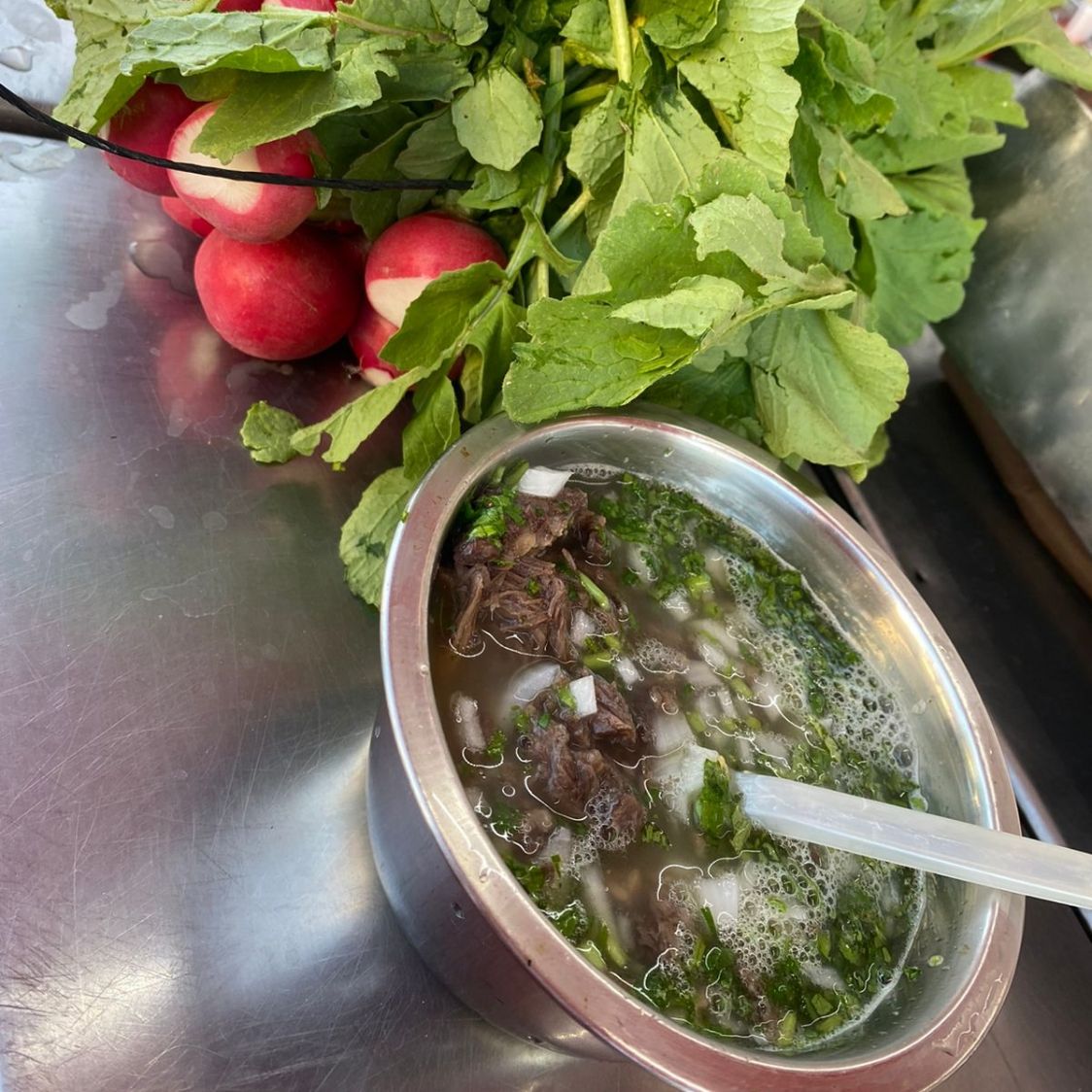 LITRO DE CAEBZA DE RES EN CALDO, TORTILLAS DE MAIZ, CEBOLLA,CILANTRO,RABANO,SALSA