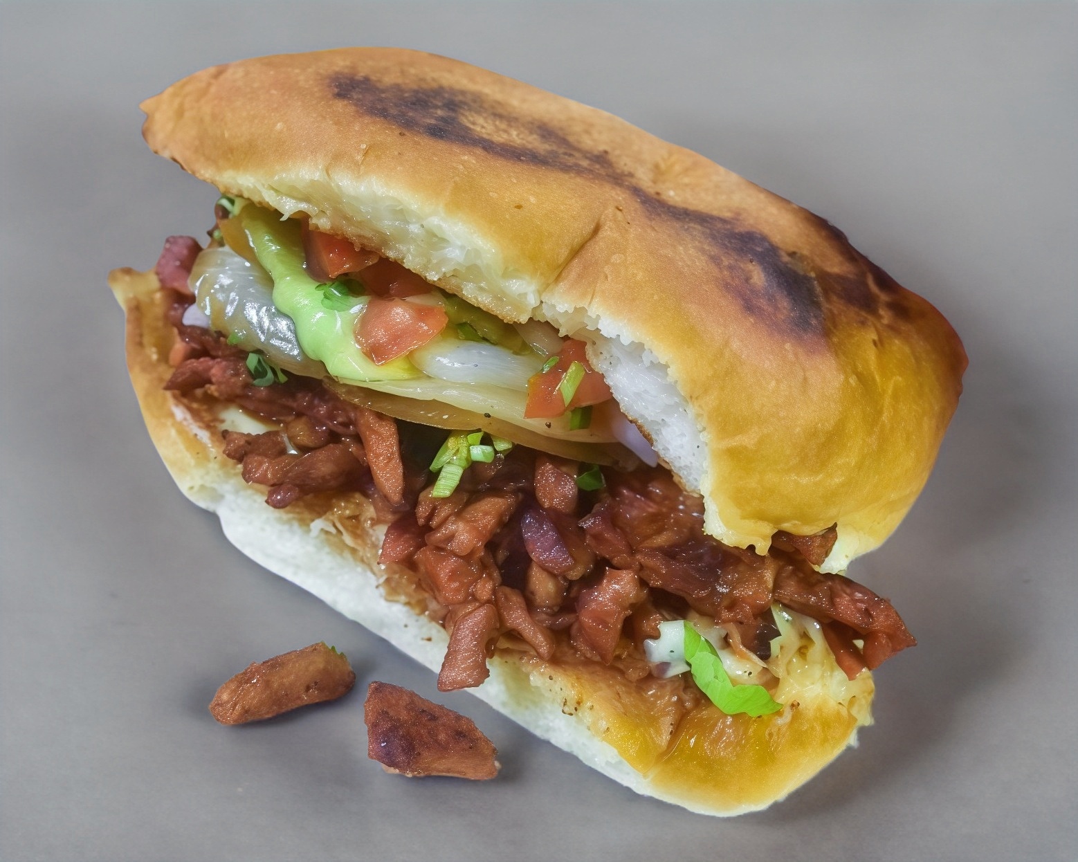 1 torta con queso al pastor en telera doradita con queso gratinado y carne al pastor. Se envían por aparte las salsas, cebolla, cilantro y guacamole