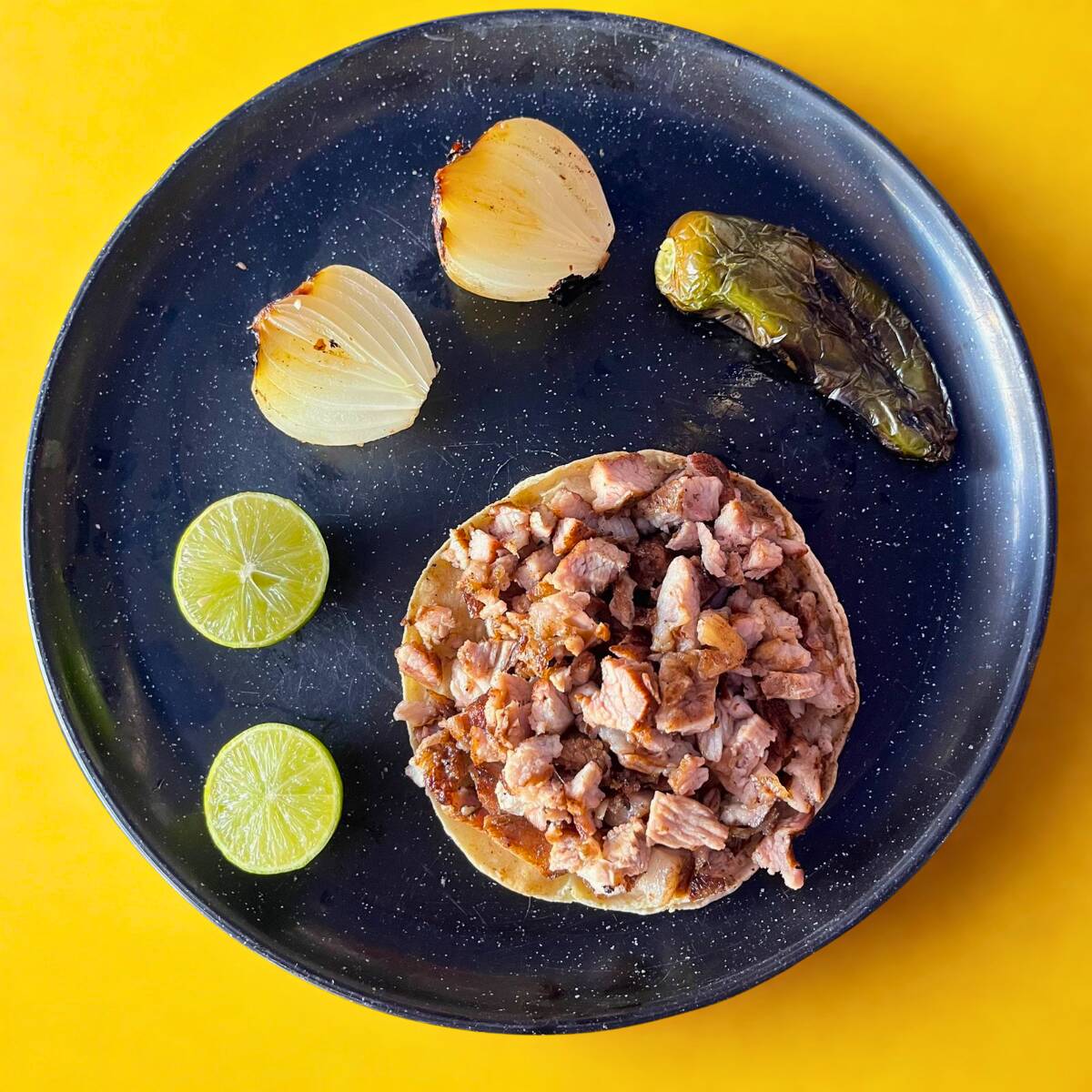 Tortilla semidorada de maíz, con carne de puerco, variedad de salsas, guacamole y verdura.