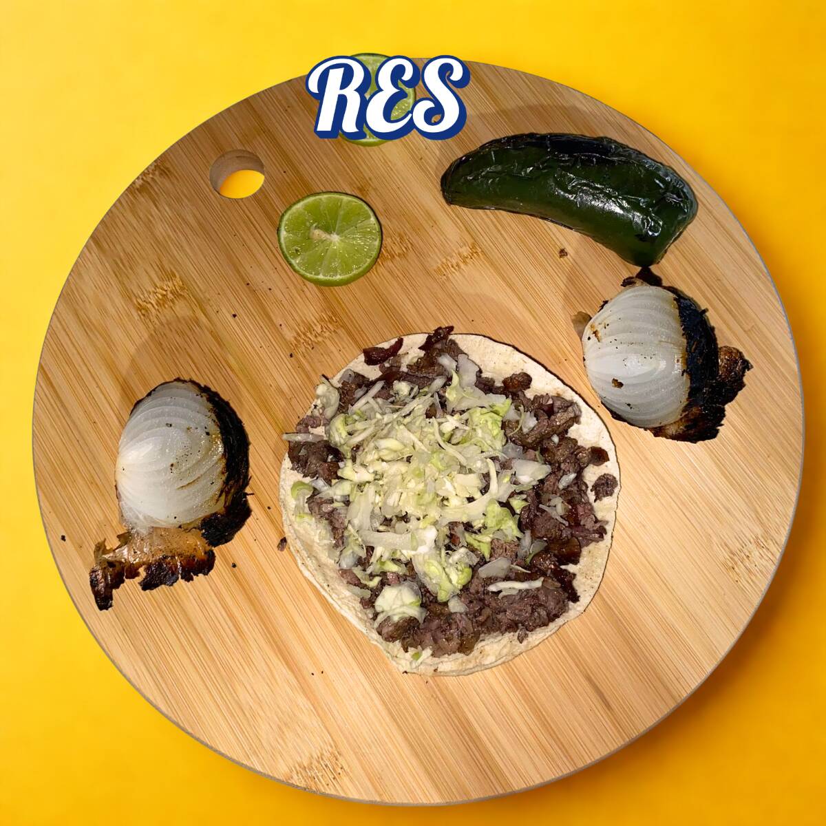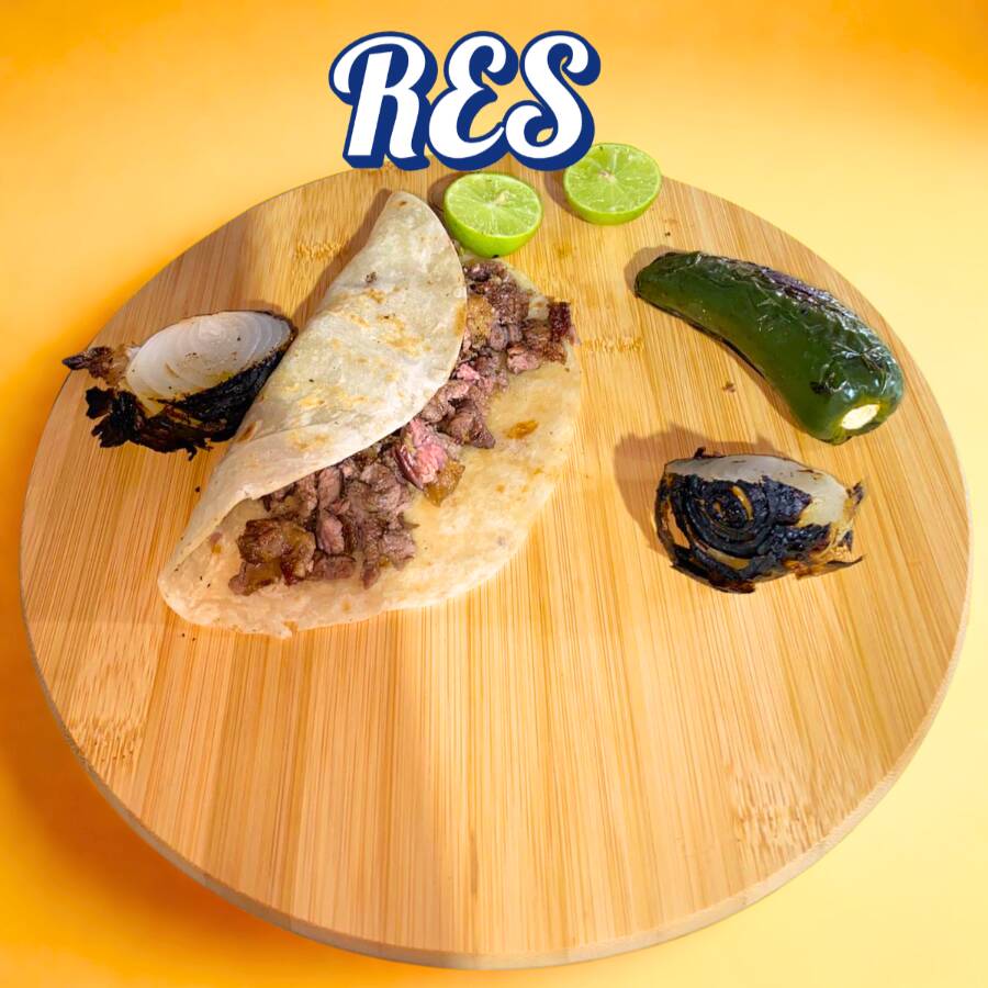 Tortilla de maíz con carne de RES, variedad de salsas, guacamole y verdura.
