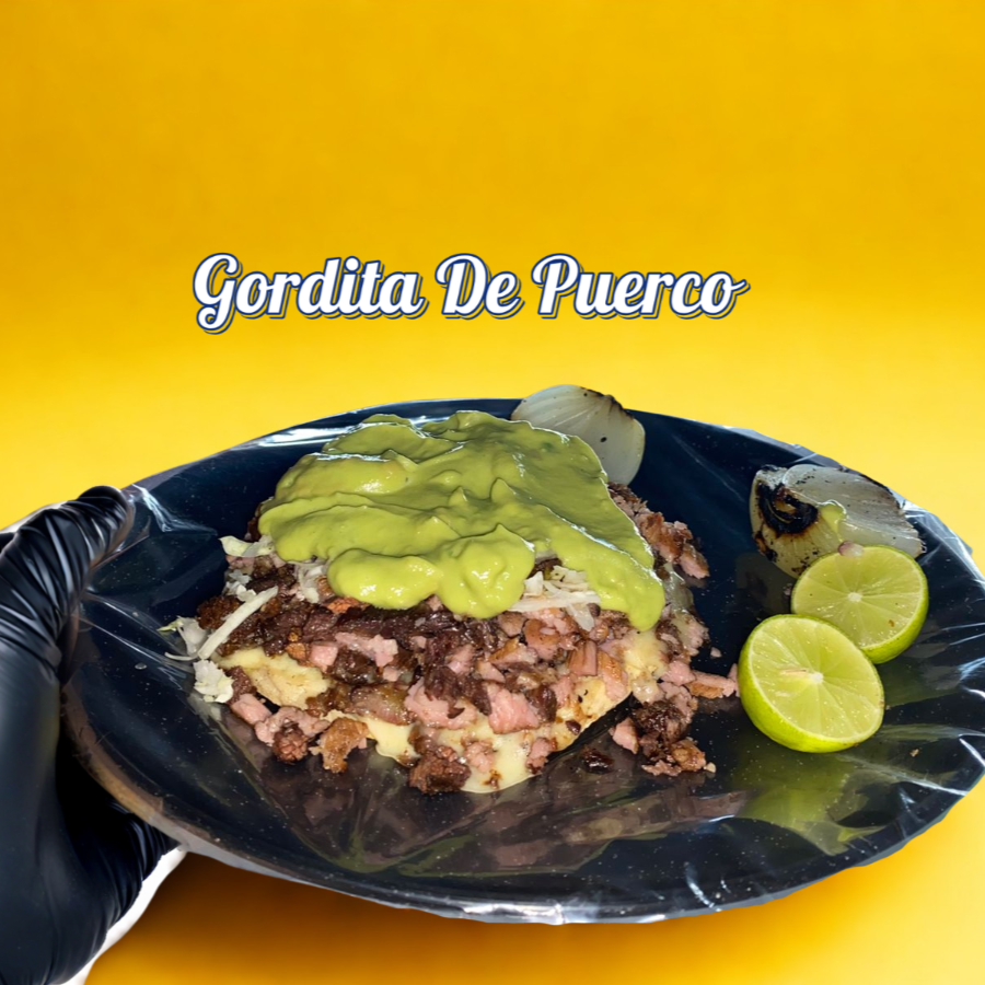 Gordita doradita de carne de puerco, asientos y queso gouda