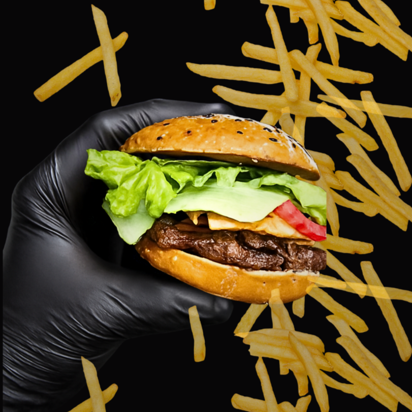 Hamburguesa con 1/4 de carne arrachera molida, papas fritas, cebolla asada, tocino frito, queso americano y amarillo, lechuga, rodajas de tomate y cebolla morada.
