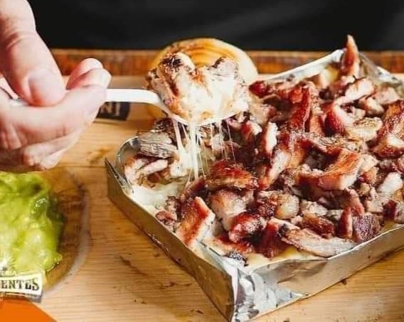 Tortilla de maíz con queso; puerco acompañado verduras y salsa