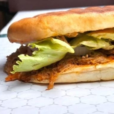 Deliciosa torta de pierna de puerco o pollo con: jamón, queso americano, cebolla, aguacate, lechuga y chile.,