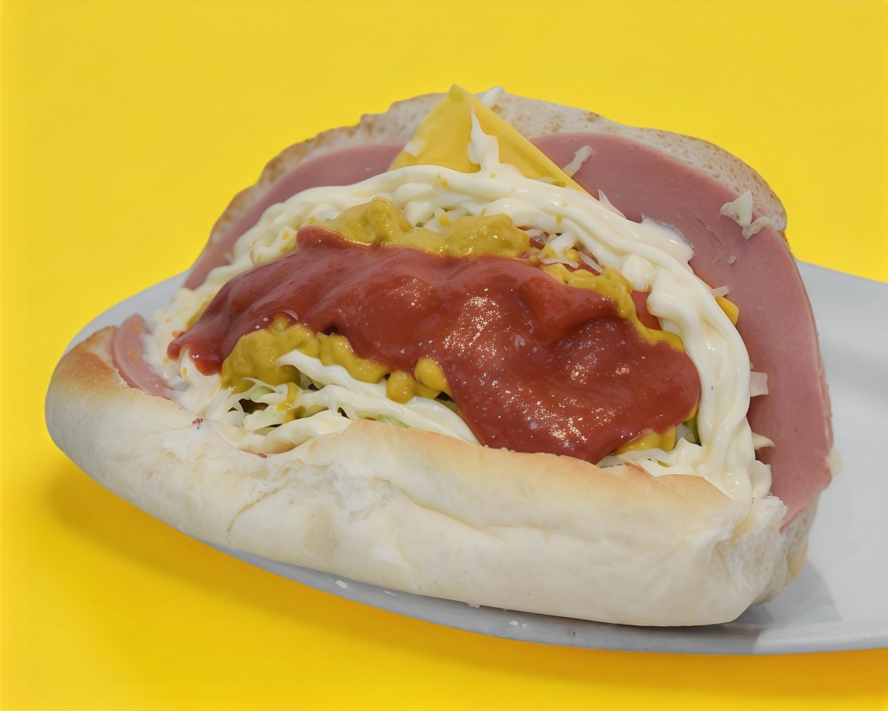 Pan "telera", bolonia de pavo, queso amarillo, tomate, repollo, mayonesa, mostaza y la magia está en la salsa.