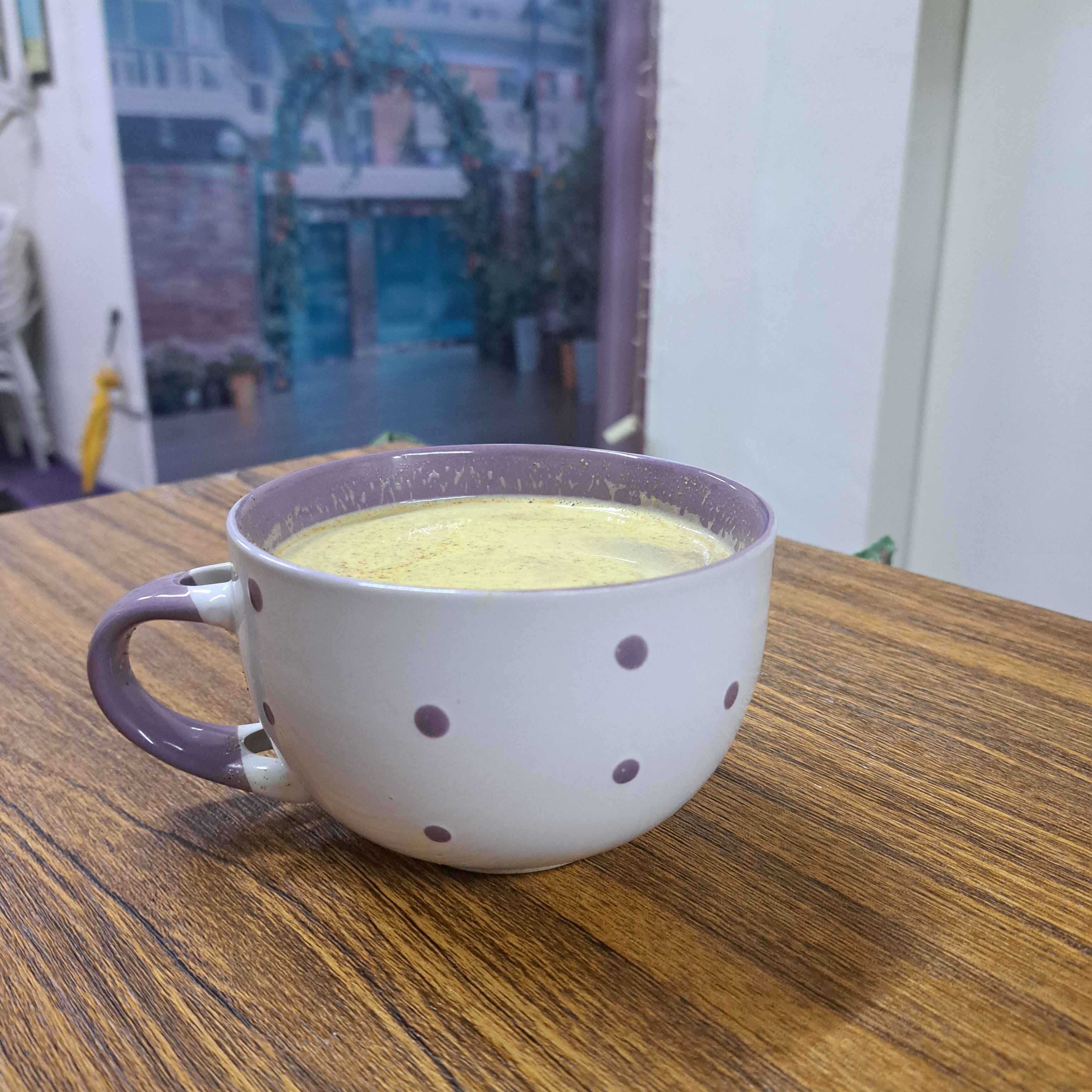 Leche dorada con café. Bebida con cúrcuma y especias, miel y leche. + un shot de espresso.