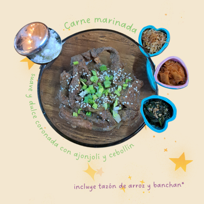 Bulgogi receta original. Carne de res marinada y cocida al estilo coreano. Incluye Banchan(acompañamientos): Kimchi de pepino, kimchi de col, espinaca salteada. + Tazón de arroz.
