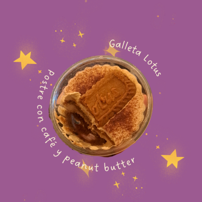 Hecho de galletas lotus bañadas en café con relleno cremoso con un ligero sabor a cacahuate.