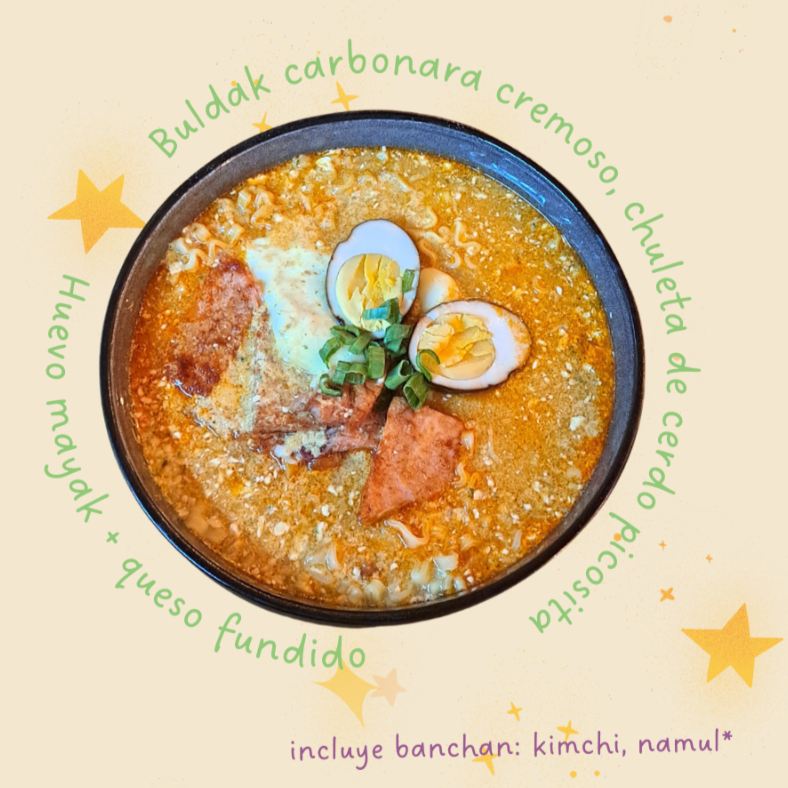 Ramen picante con huevo mayak (huevo cocido marinado), chuleta de cerdo y queso fundido. Incluye Banchan (acompañamientos): kimchi de pepino, kimchi de col, brotes de soja y espinaca preparada.