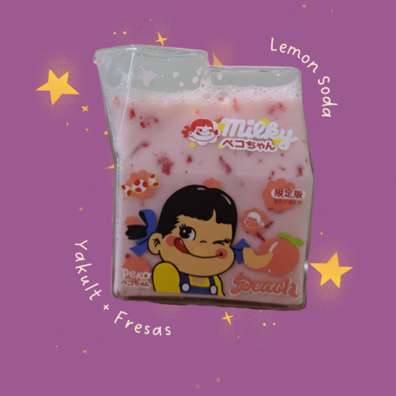 Boba, helado de vainilla, fresas y leche.