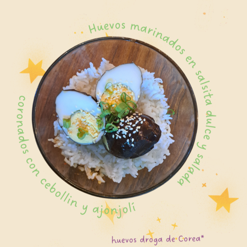 Huevos marinados en una mezcla secreta de soya y verduras con un toque dulce sobre una cama de arroz.