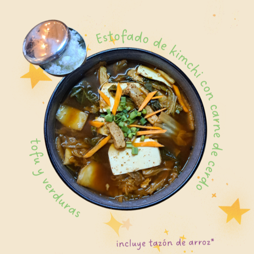 Kimchi Jjigae. Estofado de kimchi (col verde fermentada en salsa de chile y verduras) con carne de cerdo, verduras y tofu.