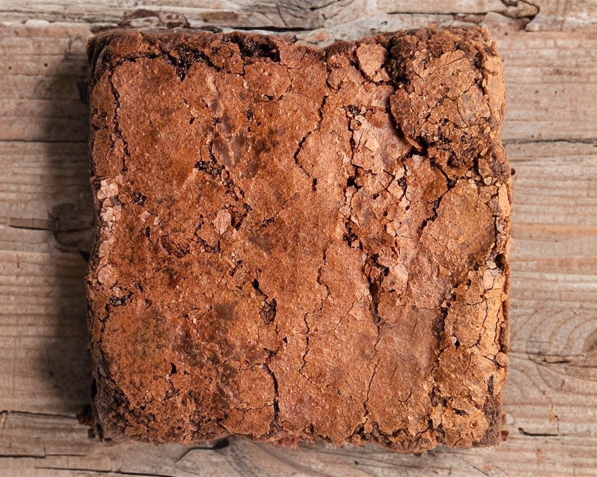 Brownie humedo extra chocolatoso con chispas de chocolate.