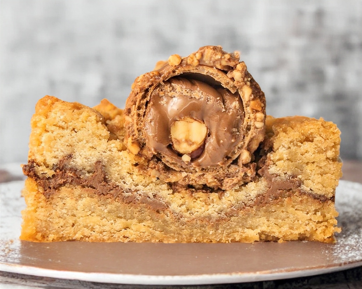Masa de vainilla en la base, relleno de crema de avellanas y chocolate ferrero®.