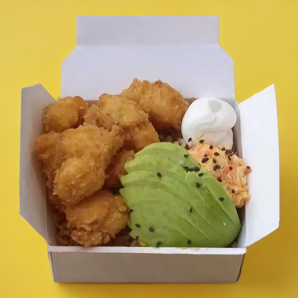 Platillo personal: arroz frito con boneless bañados en la salsa de tu elección, acompañados de queso Philadelphia, aguacate, ensalada de surimi y ajonjolí.