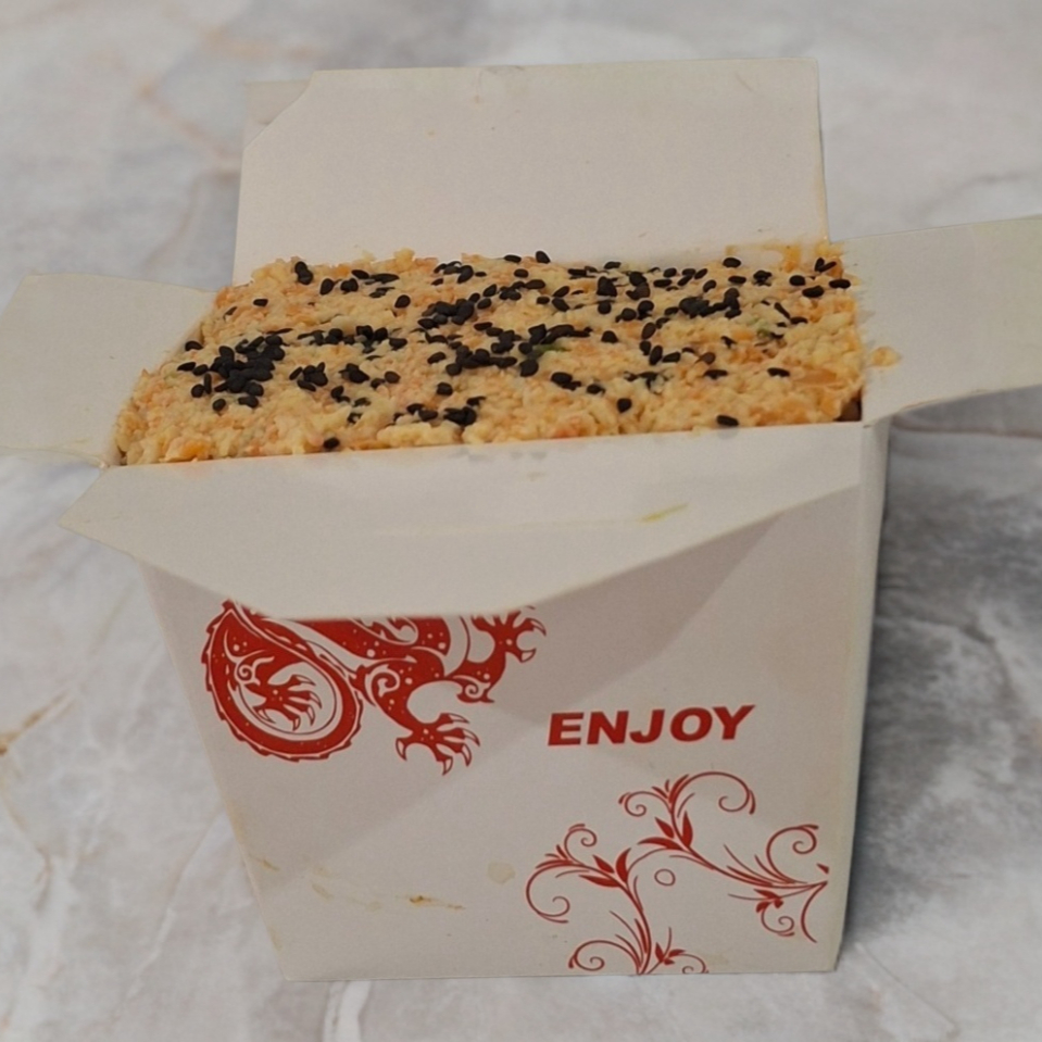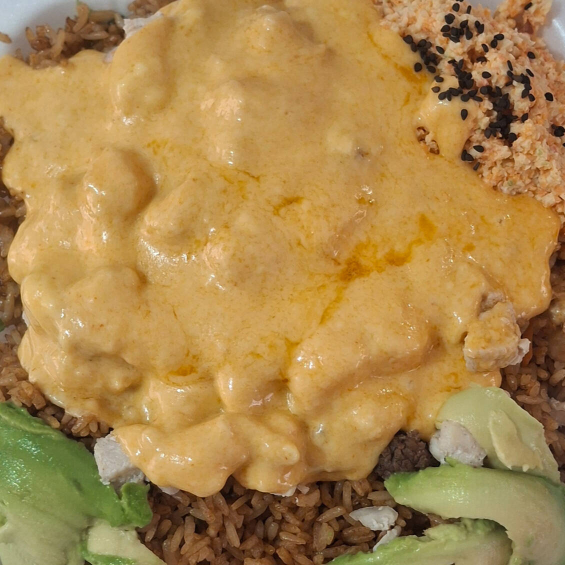 Base de arroz frito, pollo, res y camarón, queso gratinado con spicy, acompañada de ensalada surimi, aguacate y ajonjoli