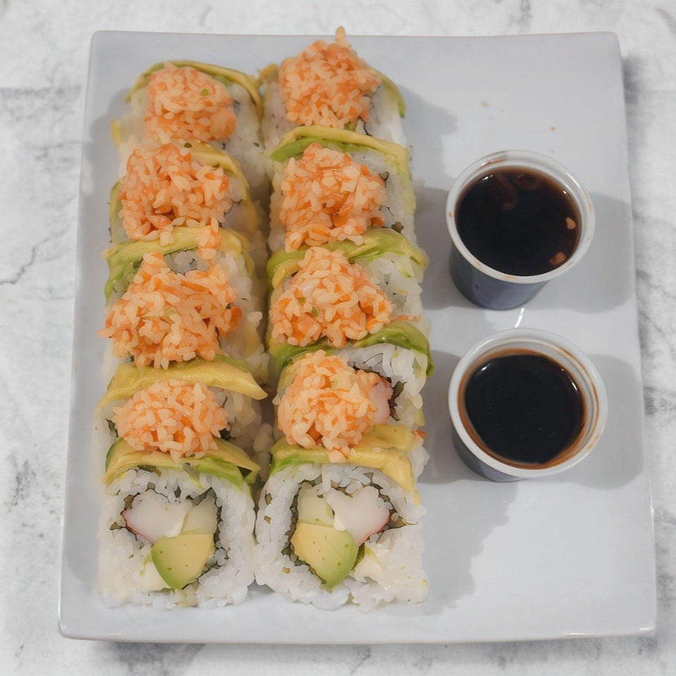 Res, camaron, chile serrano, philadelpia, aguacate, pepino, cubierto de ensalada surimi y decorado con aguacate