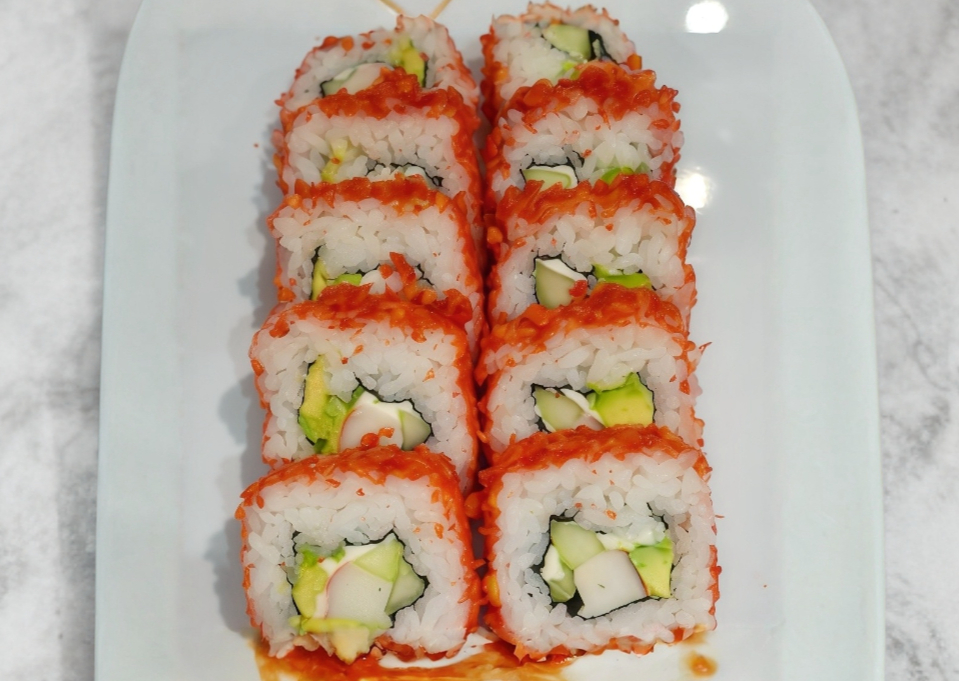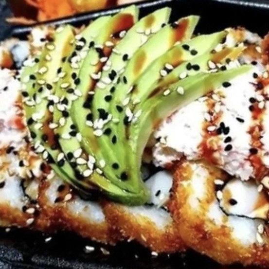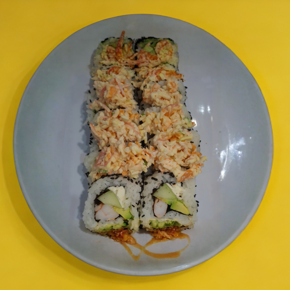 Platillo personal: rollo relleno de camarón, aguacate, queso Philadelphia y pepino; cubierto con queso gratinado, trozos de camarón y aderezo spicy.