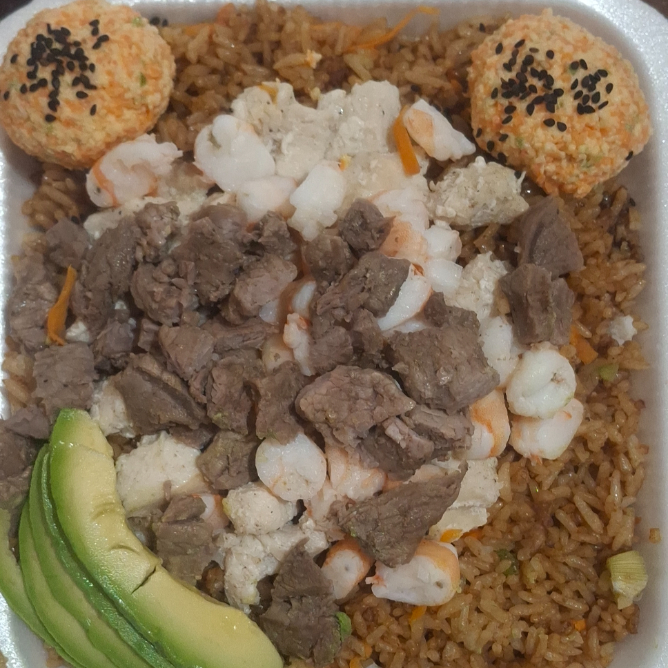Arroz frito, res, pollo y camarón acompañado de aguacate, aderezos, ensalada surumi y ajonjoli aderezos