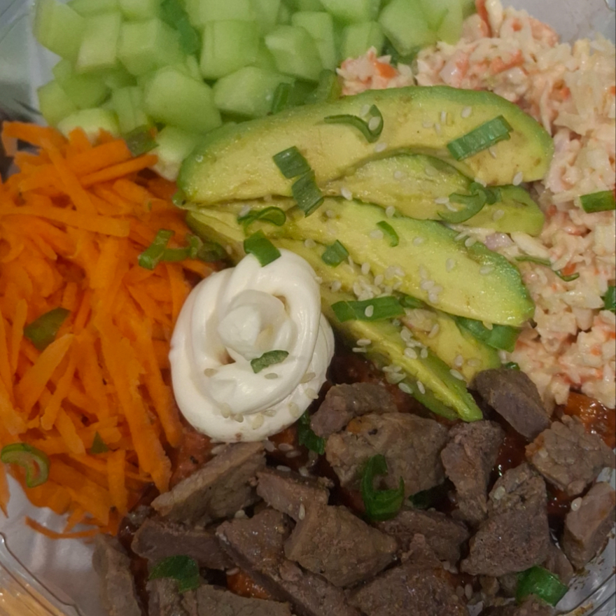 Base de arroz, zanahoria, pepino, surimi, elotito, aguacate, carne en trozos decorado con cebollin, ajonjoli y queso crema.