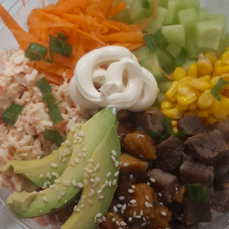 Base de arroz frito, pollo, res y camarón, acompañado de ensalada surimi, aguacate y ajonjoli